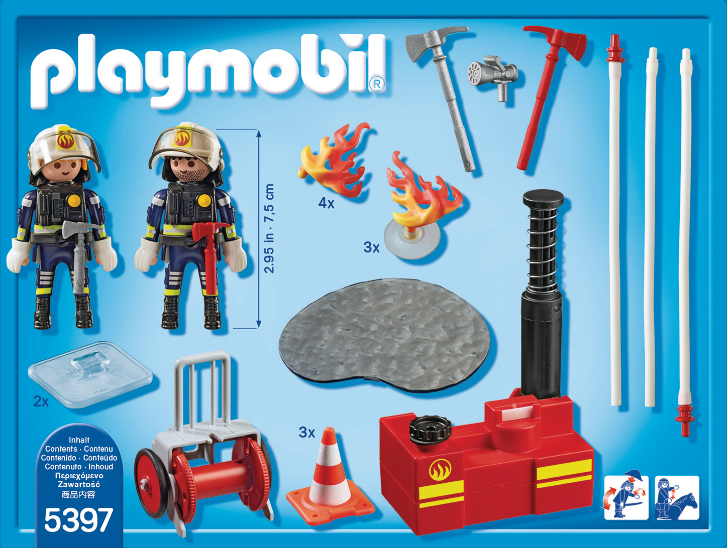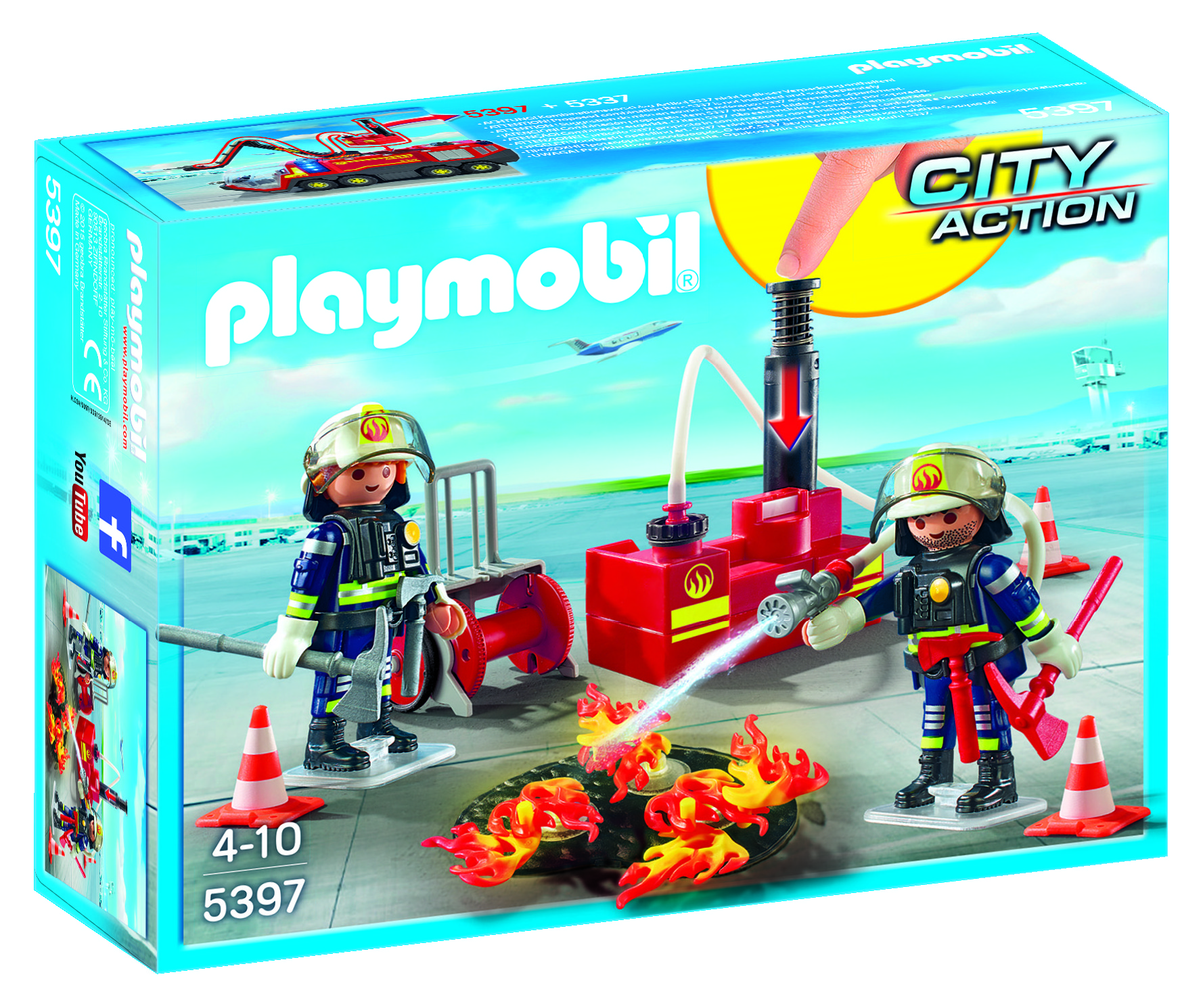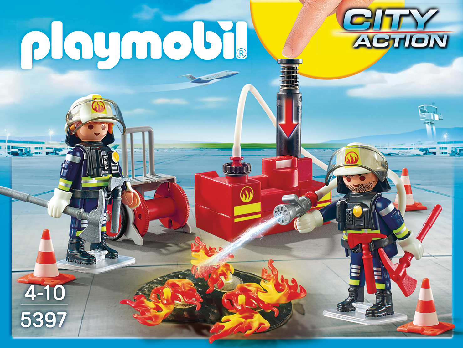 Les pompiers sont en mission, ils maitrisent le feu à l'aide de leur pompe projetant de l'eau. Peut-être combiné avec la réf. 5337 Pompiers avec véhicule aéroportuaire.
