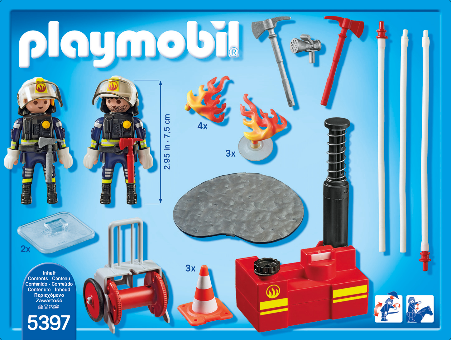 La boîte contient Contient 2 pompiers, 1 lance à incendie avec réservoir d'eau, 3 plots, et d'autres accessoires. La lance à incendie fonctionne.