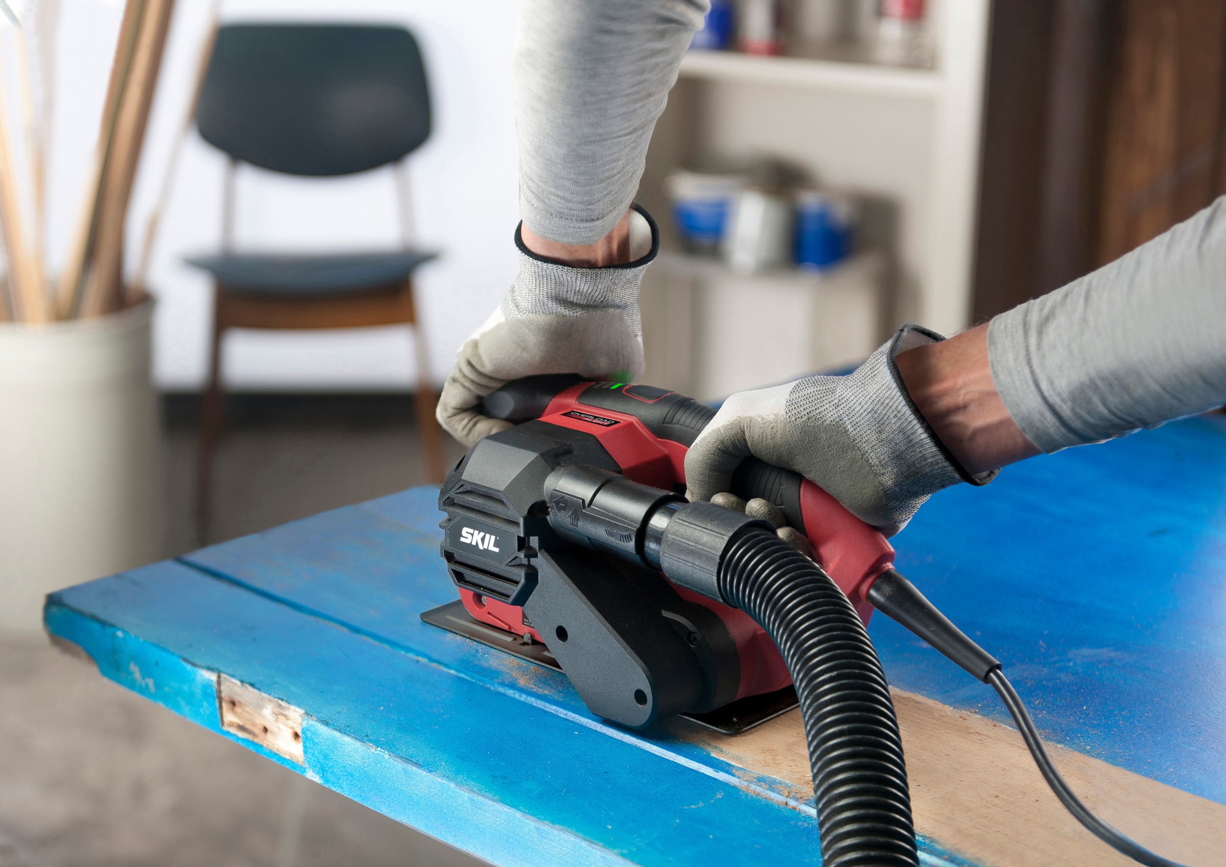 Avec son moteur puissant de 710 W et sa vitesse de bande élevée de 320 m/min, cette ponceuse constitue un choix excellent pour un enlèvement de matière rapide. Elle est idéale pour les travaux exigeants, notamment le dégrossissage de portes et d’étagères avant de les repeindre. Le cadre de ponçage « Equalizer » breveté de SKIL assure une très grande précision. Il évite la formation de rayures et éraflures et permet d’aplanir parfaitement une surface. Le cadre de ponçage « Equalizer » offre comme autre avantage le fait de ne pas avoir à le retirer pour changer de bande de ponçage. Le maintien parfait de la bande de ponçage par le système ABC (« Automatic Belt Control ») évite d’avoir à recentrer manuellement la bande en cours d’utilisation. Des performances optimales et une grande durée de vie sont également garanties par l’éclairage LED « Overload Alert ». La ponceuse comprend un système intégré d’aspiration des poussières avec un boîtier à poussière pratique. La machine est également équipée d’un raccord pour le branchement d’un aspirateur ménager standard afin d’améliorer la propreté du travail à l’intérieur. La ponceuse SKIL 7615 AB est fournie avec un cadre de ponçage « Equalizer », une bande de ponçage, un boîtier à poussière et un adaptateur pour aspirateur.