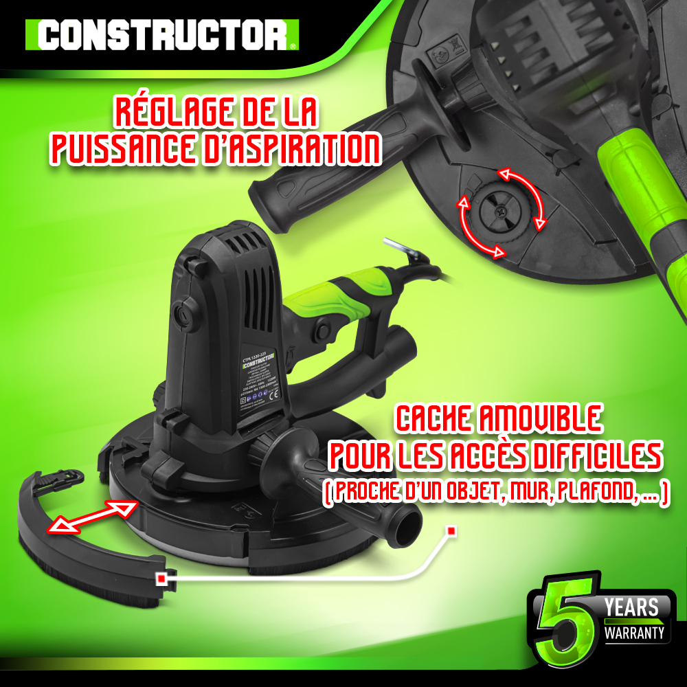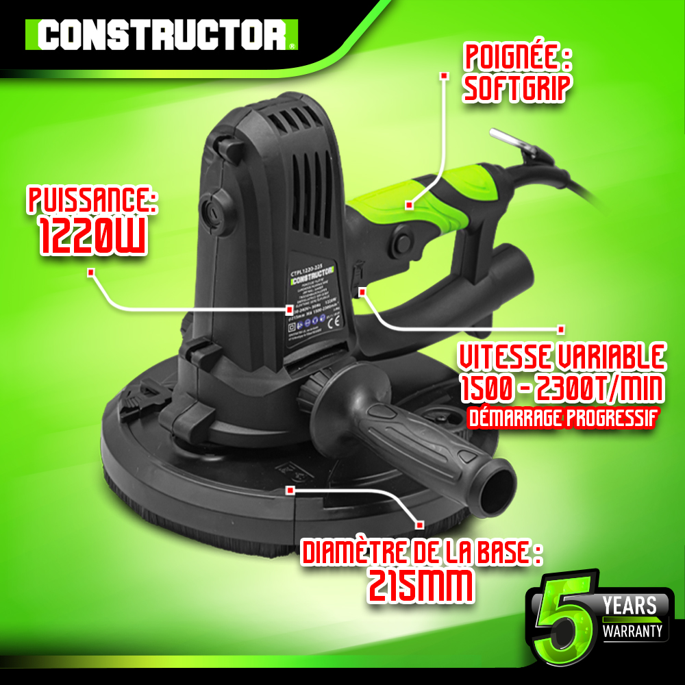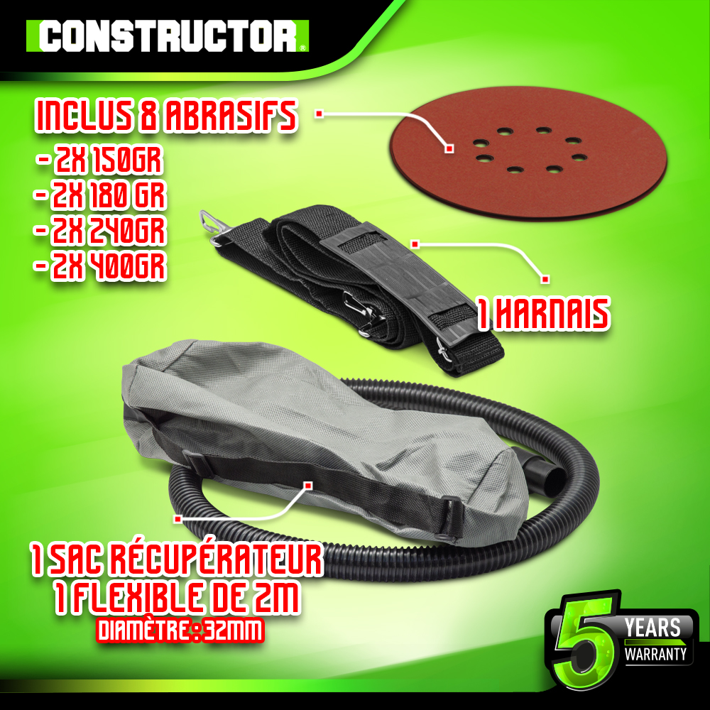 Libellé Ponceuse plâtre 1220W - 225mm avec sac récupérateur et 8 abrasifs - Constructor