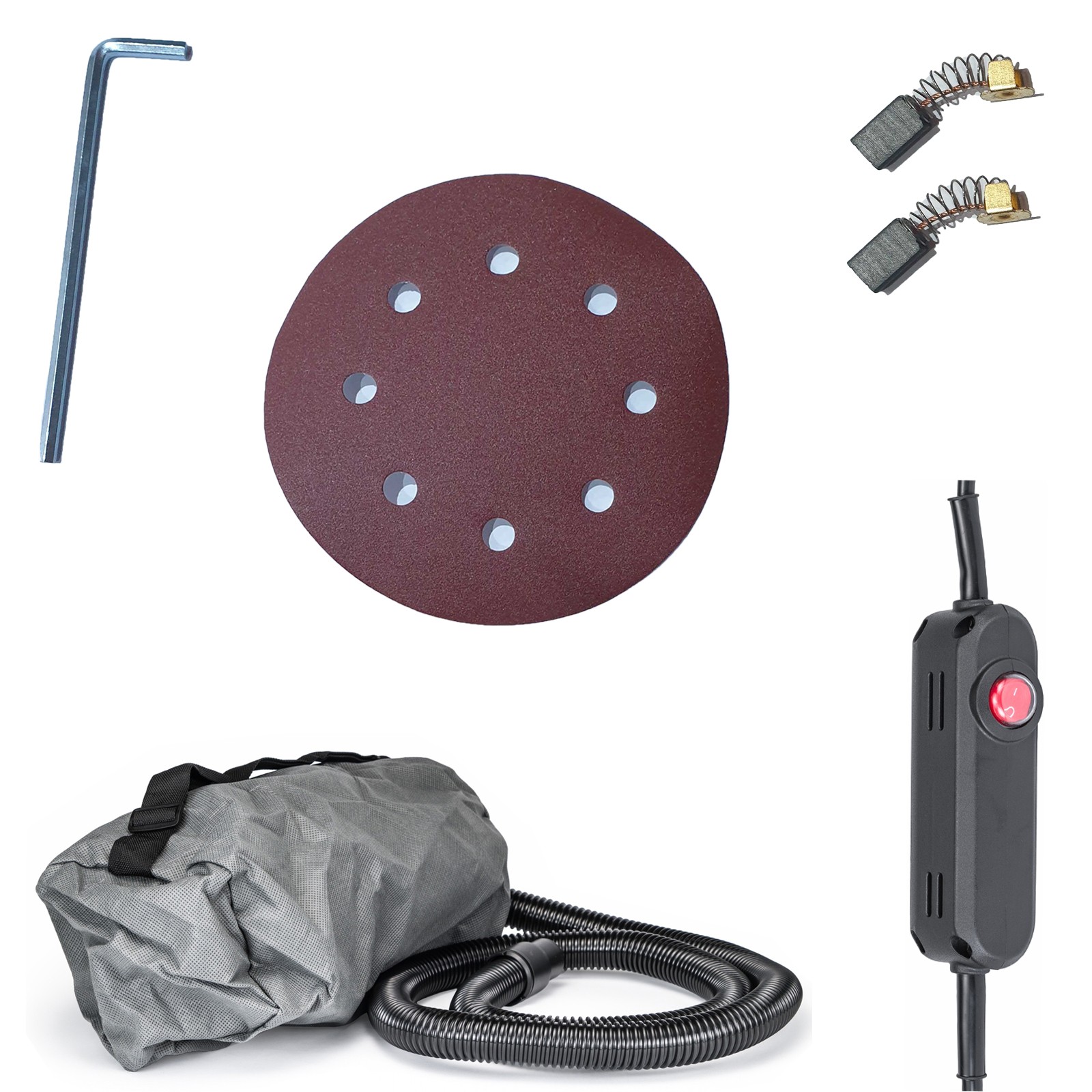 | Accessoires inclus | 1 sac de récupération, 1 tuyau, 2 balais de charbon de rechange, 1 clé Allen, 2 bouchons d'oreille pour protection et 12 disques abrasifs |