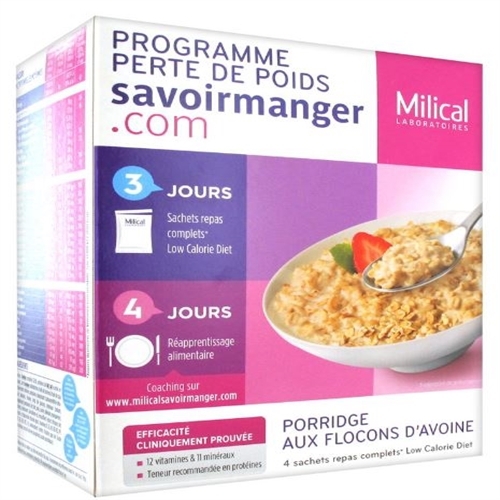 | Avertissements | Les sachets repas complets Low Calorie Diet (LCD) s'utilisent dans le cadre d'un programme perte de poids milicalsavoirmanger.com. Ils couvrent tous les besoins nutritionnels en nutriments essentiels pour une journée. Leur consommation au-delà de 21 jours consécutifs requiert un suivi particulier par un professionnel de santé. Les régimes amaigrissants sans surveillance médicale sont particulièrement déconseillés aux enfants, aux adolescents encore en croissance, aux femmes enceintes ou allaitantes et aux personnes âgées. Il convient de maintenir une consommation d'eau suffisante au cours de la journée (1.5 à 2 litres). |