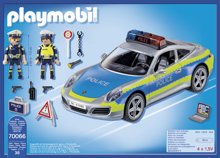 Contient 2 personnages et des accessoires (pistolets, menottes, panneaux, valise)