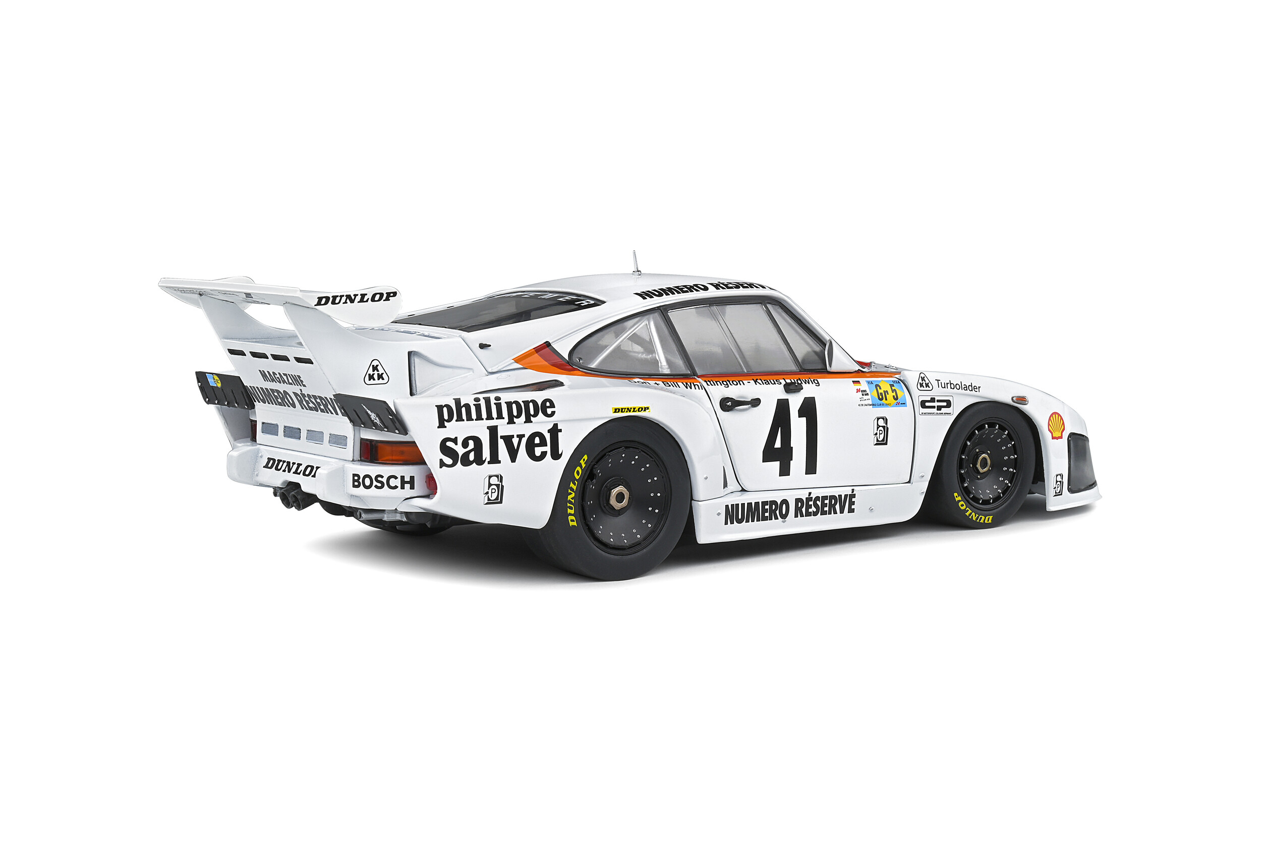 | Plus produit | Maquette 1:18 très détaillée de la Porsche 935 K3 (24H 1979) avec livrée blanche n°41, grand aileron, jantes noires multi-trous et marquages Dunlop, finitions fidèles pour collection et vitrine. |