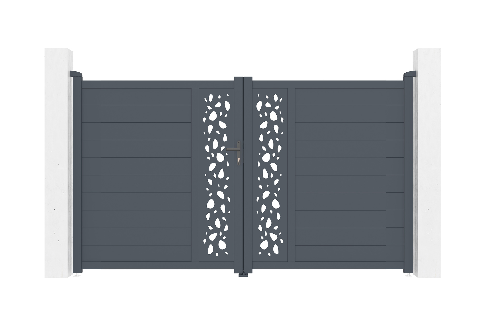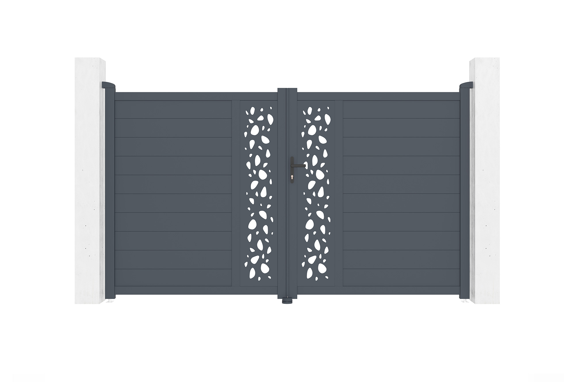 Découvrez notre portail battant SUNNY, véritable déclaration de style et de sophistication grâce à ses plaques décoratives au motif "galets", rappelant la tranquillité d'un jardin zen.