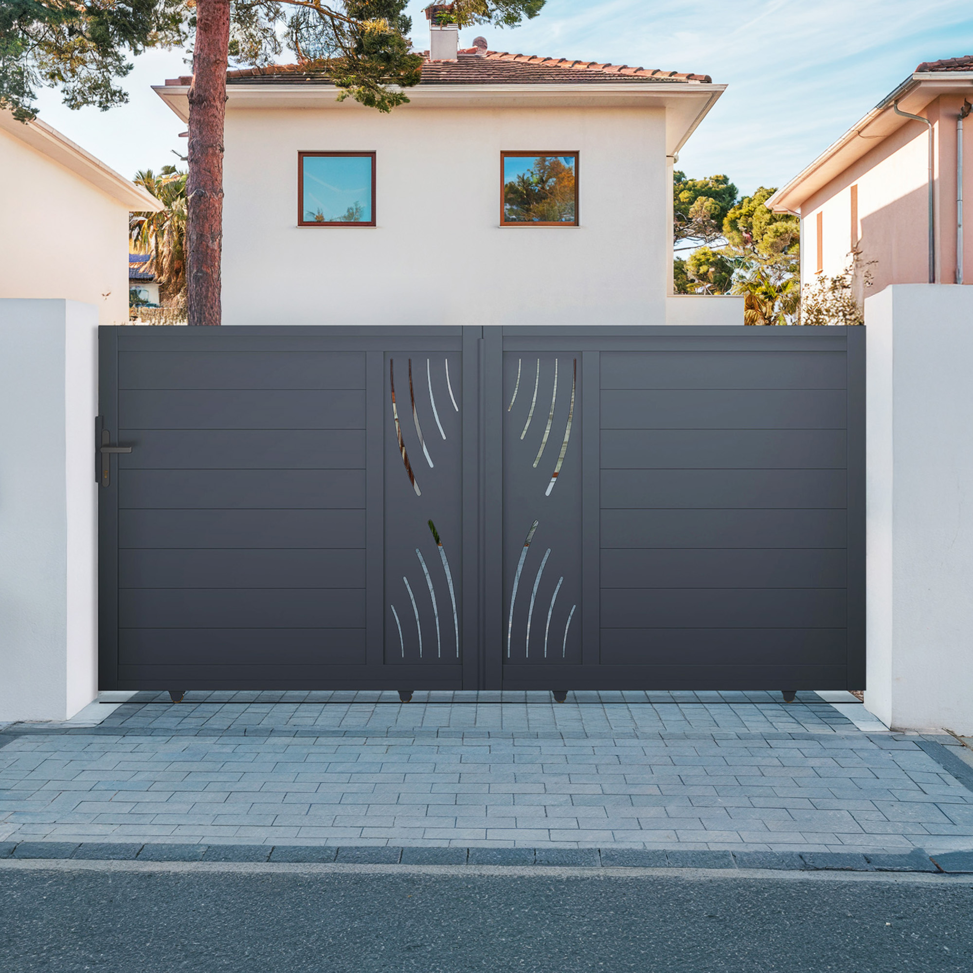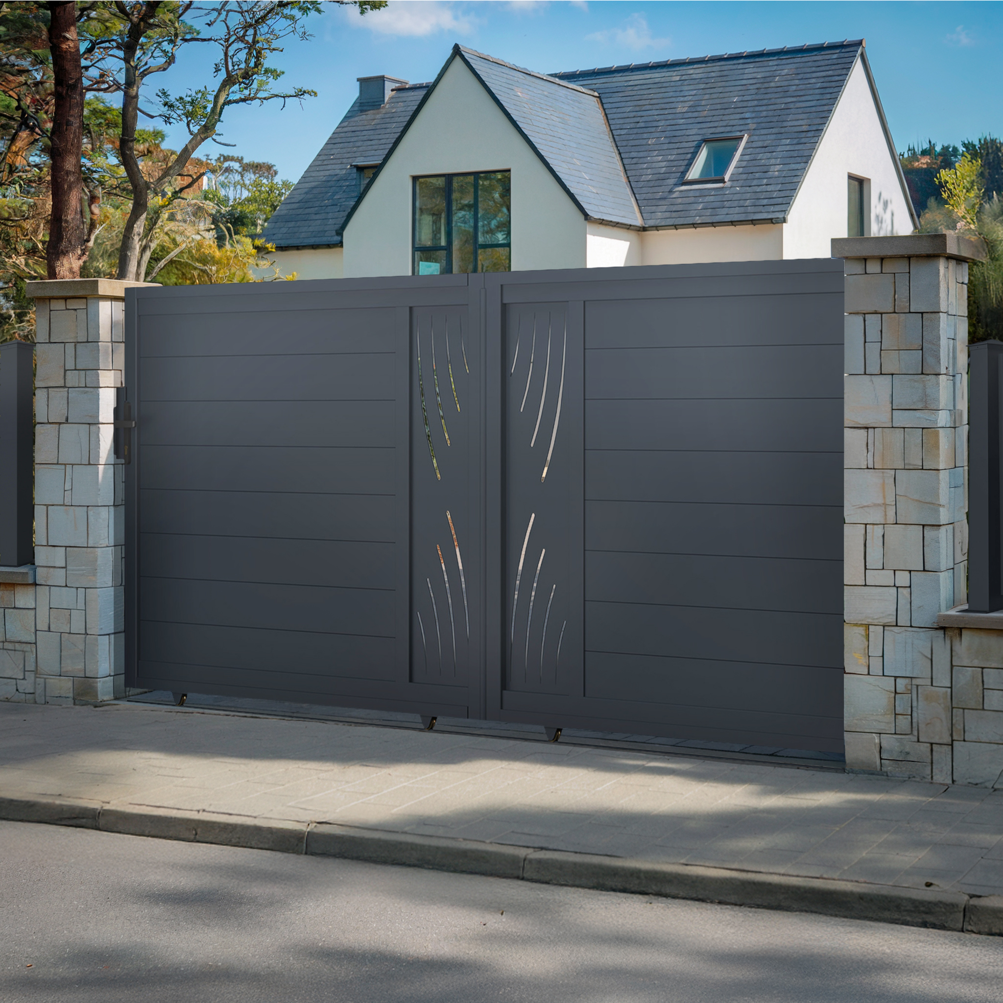 Découvrez l'élégance inégalée de notre portail coulissant en aluminium VELETA orné de ses plaques décoratives aux motifs de style "Nature"