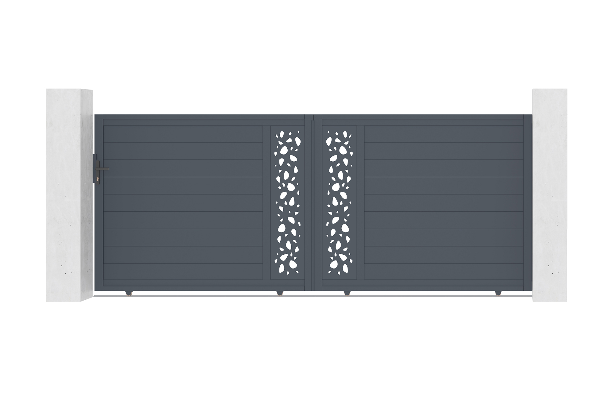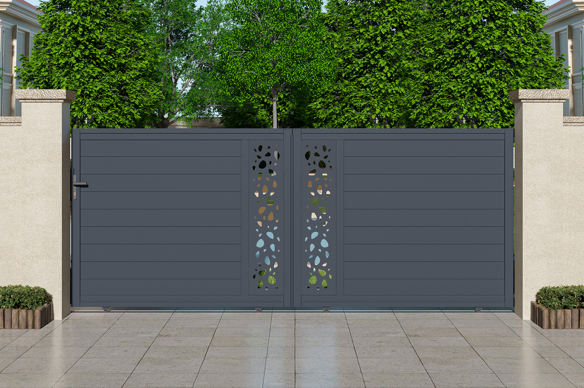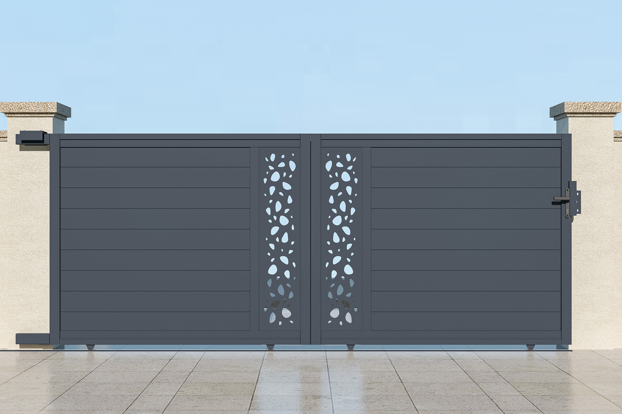 Découvrez notre portail coulissant SUNNY, véritable déclaration de style et de sophistication grâce à ses plaques décoratives au motif "galets", rappelant la tranquillité d'un jardin zen.