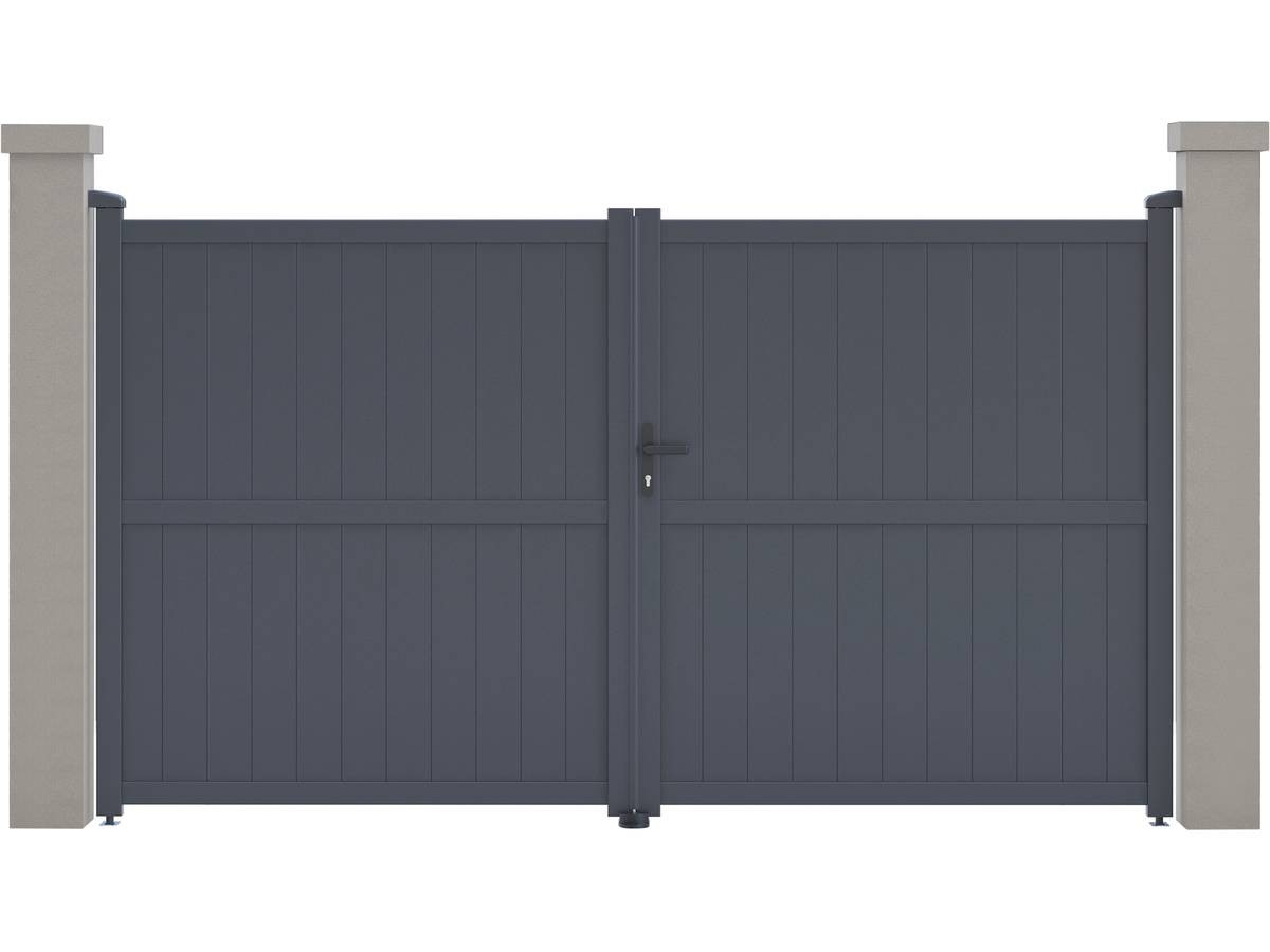 Portail aluminium "Maurice"Nous vous proposons le portail en aluminium "Maurice". Il viendra apporter modernité et sécurité à votre entrée, il protègera votre habitation d'une manière optimale.Il est particulièrement résistants aux intempéries et nécessite peu d'entretien au quotidien. De plus il offre une parfaite tenue dans le temps, grâce à sa structure en aluminium et a une bonne résistance aux UV et a un traitement antirouille.Son design plein vous protègera du voisinage et des passants et préservera votre intimité des regards extérieurs. Portail aluminium "Maurice" - Dimensions : 299.5 x 155.9 cm - Gris - Structure : aluminium - 2 portes avec serrure et poignée - Ancrages intérieurs et extérieurs - Anti-UV - Anti-rouille - Livré en kit - Piliers non inclus. .Descriptif: Portail aluminium Maurice Vendu en kit Piliers non inclus