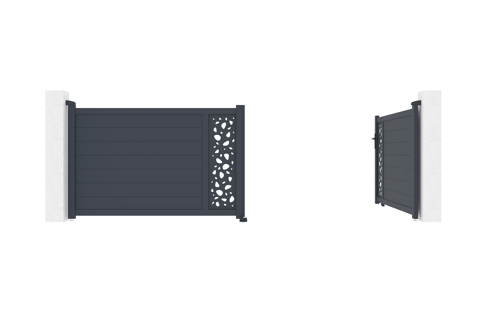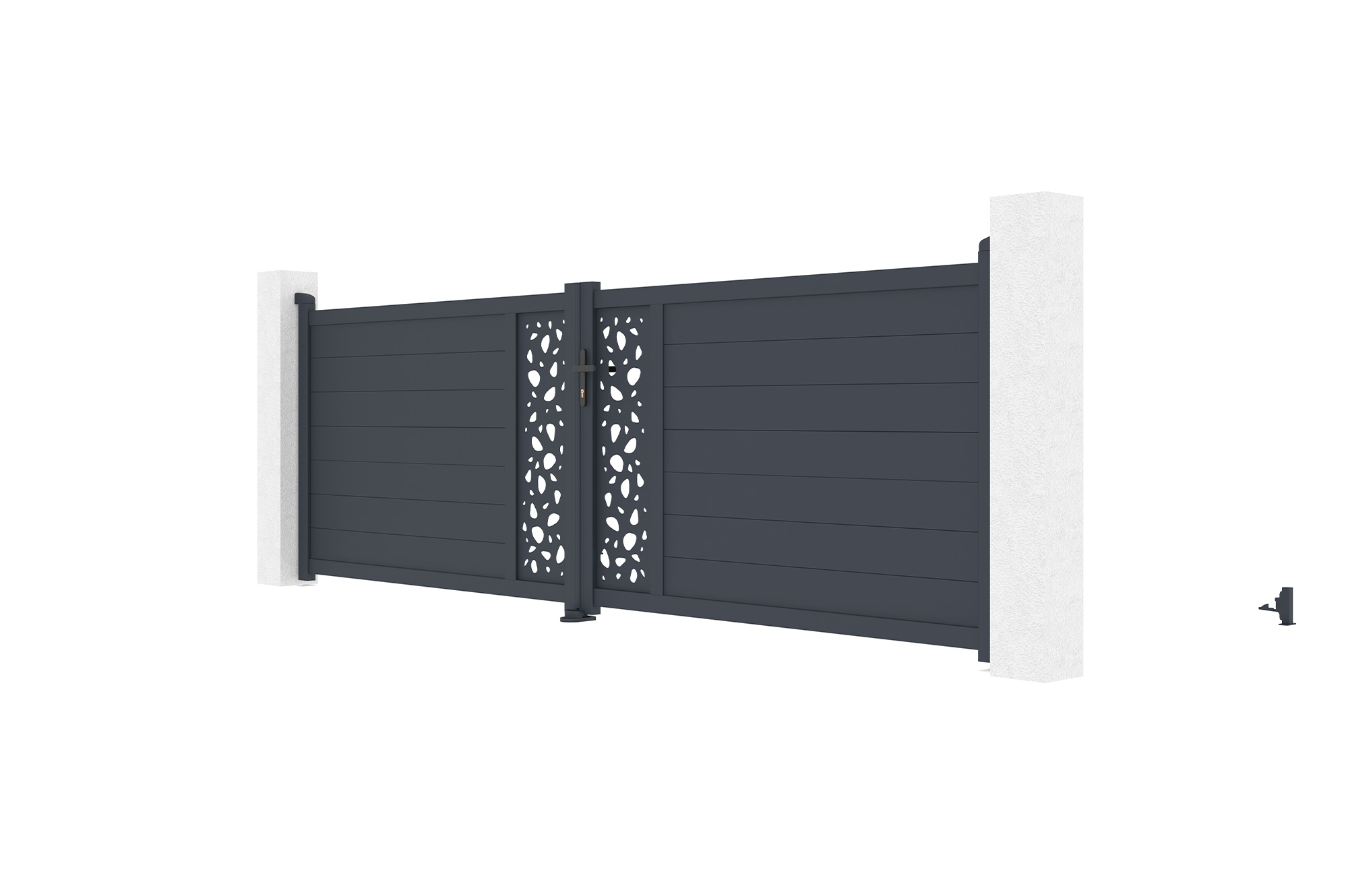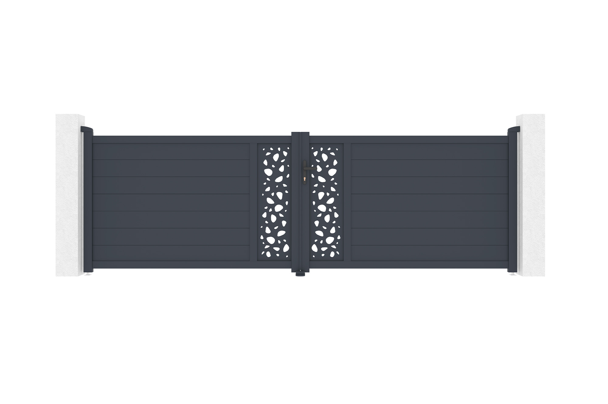 Découvrez notre portail battant SUNNY, véritable déclaration de style et de sophistication grâce à ses plaques décoratives au motif "galets", rappelant la tranquillité d'un jardin zen.