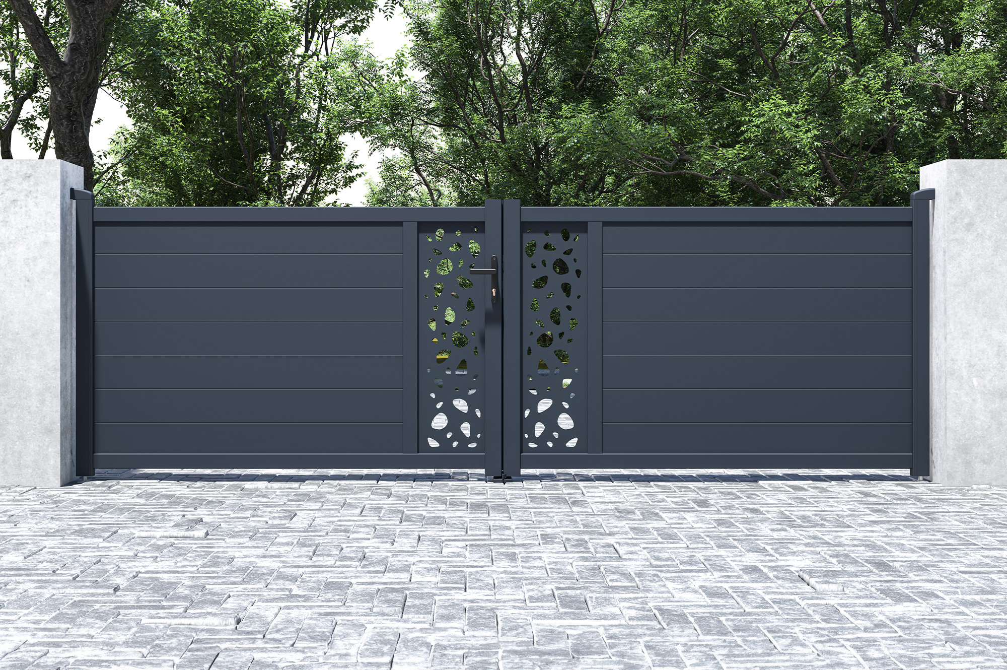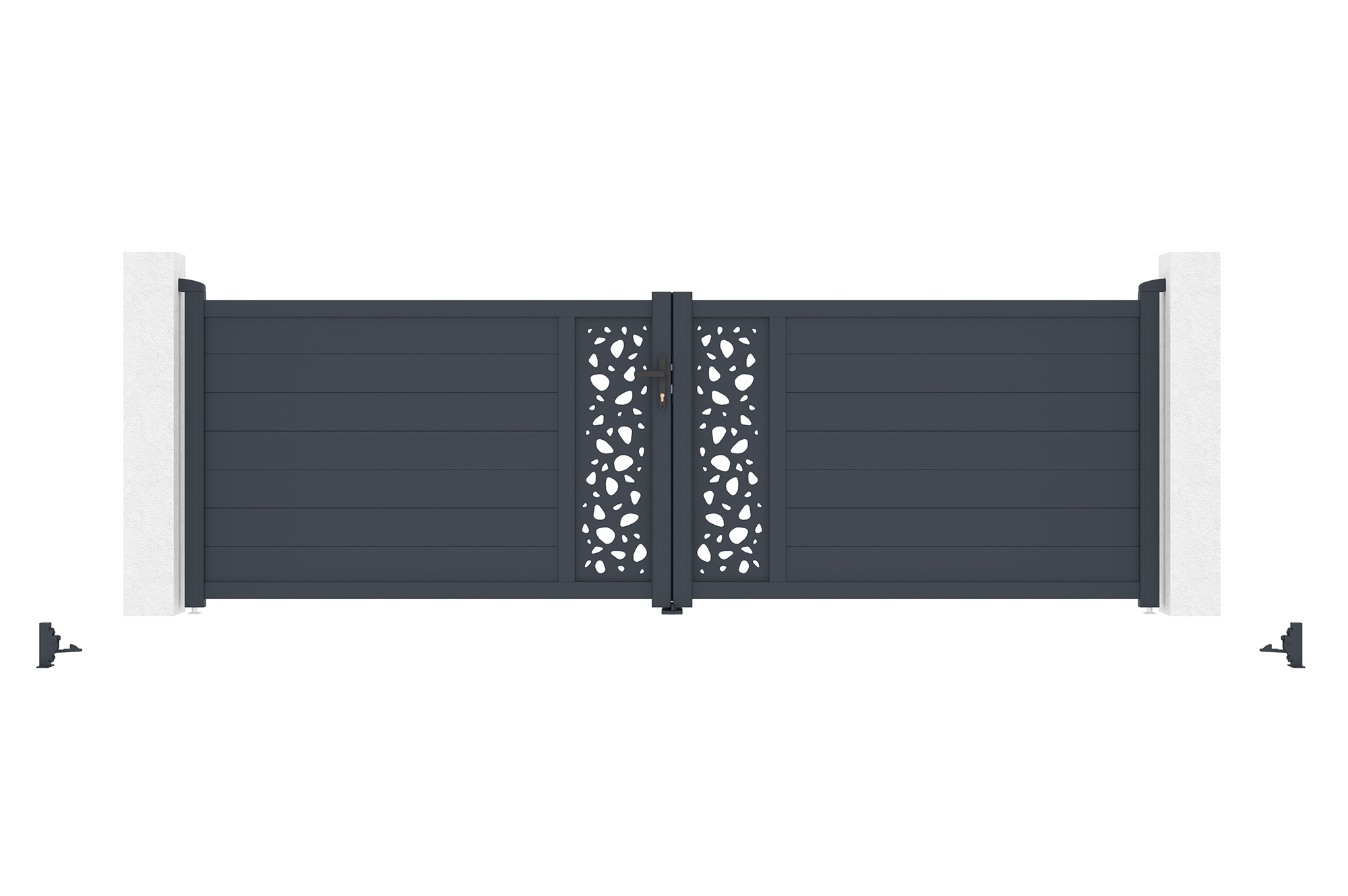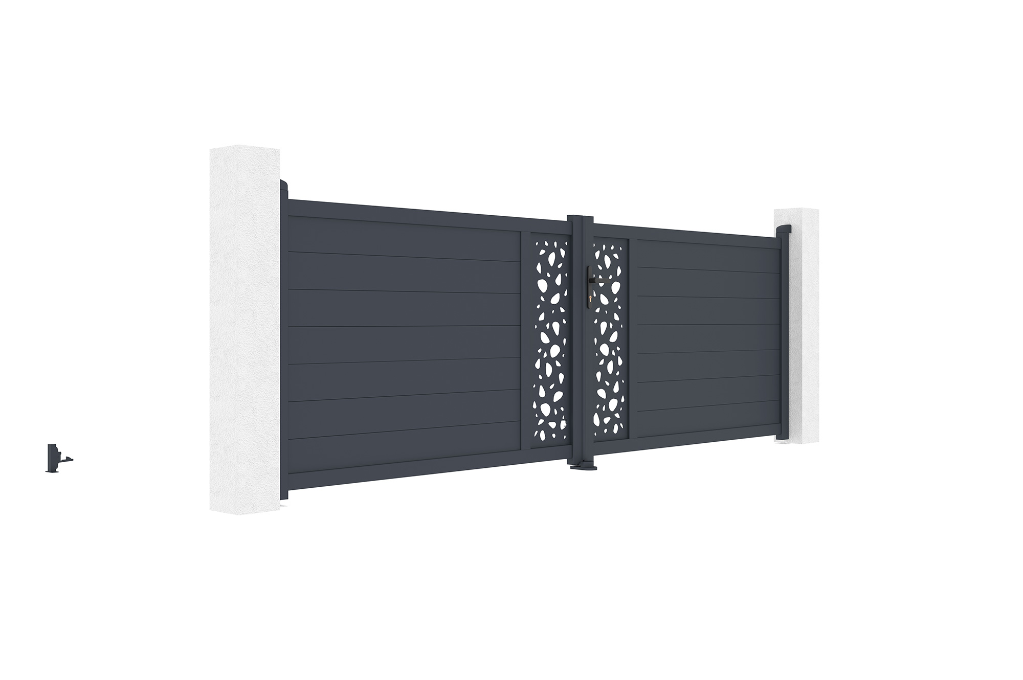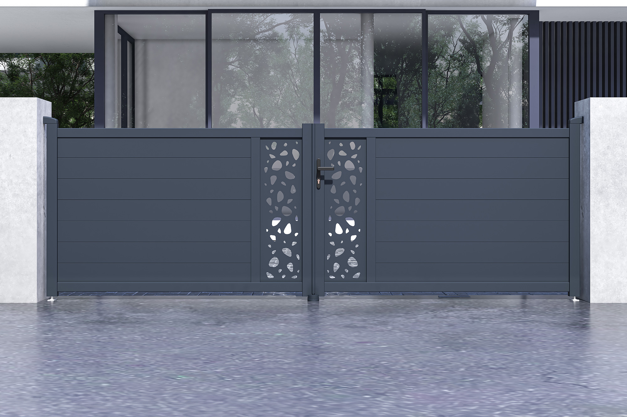 Découvrez notre portail battant SUNNY, véritable déclaration de style et de sophistication grâce à ses plaques décoratives au motif "galets", rappelant la tranquillité d'un jardin zen.