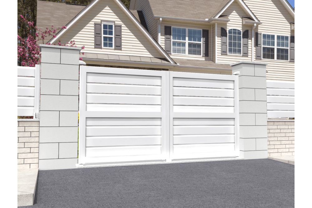 Portail double battant à panneau brise-vue. Montage rapide et facile. Coloris Blanc. Fabrication française en aluminium thermolaqué de haute qualité. Installation simplifiée grâce aux gonds et crapaudines. Livraison en kit prêt à poser. Motorisation avec éléments de sécurité (témoin lumineux). Largeur 3000mm x Hauteur 1880 mm.