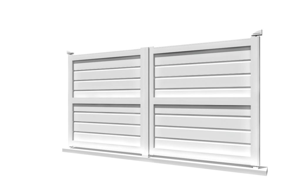 Portail double battant à panneau brise-vue. Montage rapide et facile. Coloris Blanc. Fabrication française en aluminium thermolaqué de haute qualité. Installation simplifiée grâce aux gonds et crapaudines. Livraison en kit prêt à poser. Motorisation avec éléments de sécurité (témoin lumineux). Largeur 4000mm x Hauteur 1580 mm.