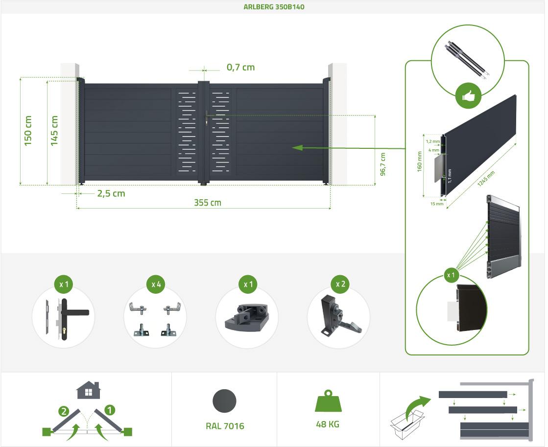| Libellé | Portail battant électrique 3,5m ARLBERG 350B140 gris + Motorisation TANKER B700 |