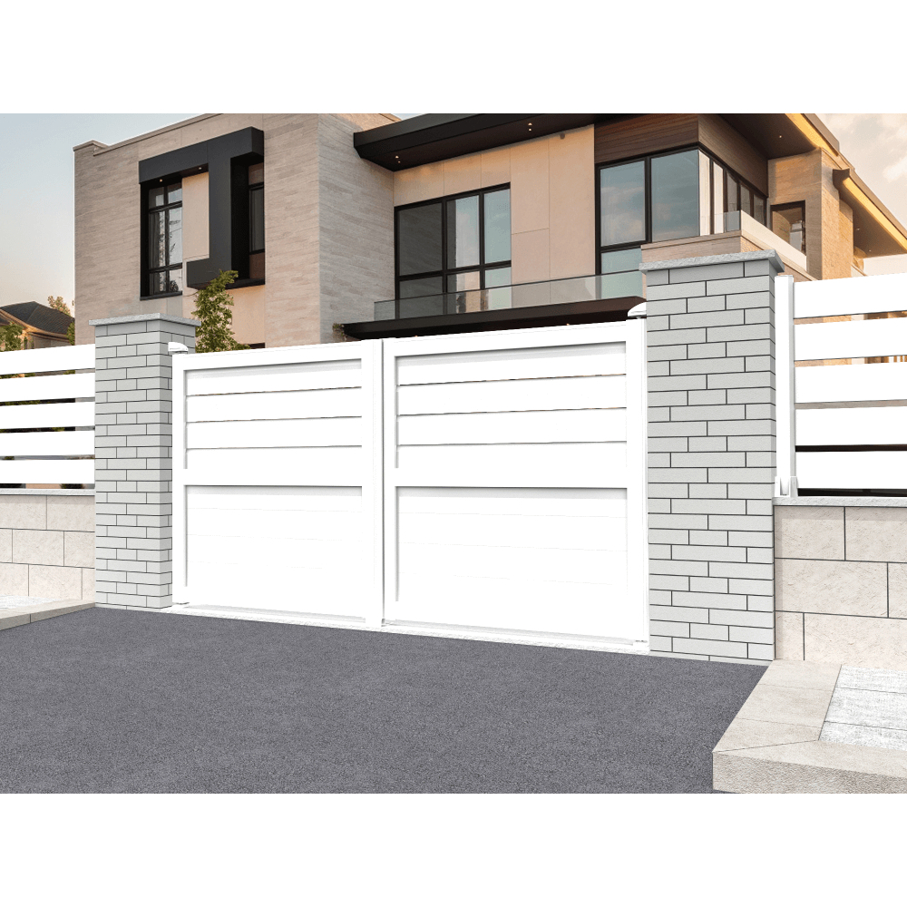 Portail double battant à panneau mixte (haut brise-vue et bas plein). Montage rapide et facile. Coloris Blanc. Fabrication française en aluminium thermolaqué de haute qualité. Installation simplifiée grâce aux gonds et crapaudines. Livraison en kit prêt à poser. Motorisation avec éléments de sécurité (témoin lumineux). Largeur 3500mm x Hauteur 1894.8 mm.