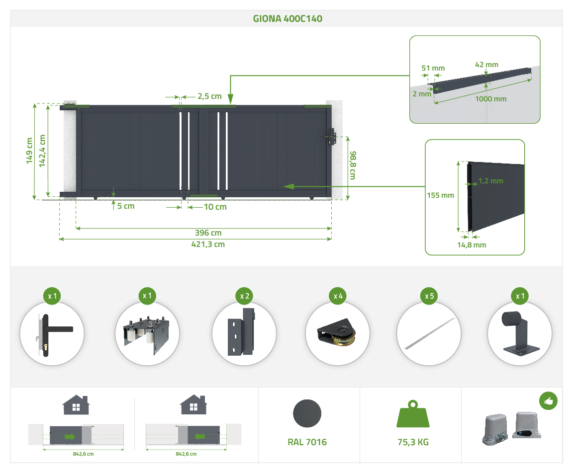 Libellé Portail coulissant 4m GIONA H.140cm alu + motorisation RANGER C300