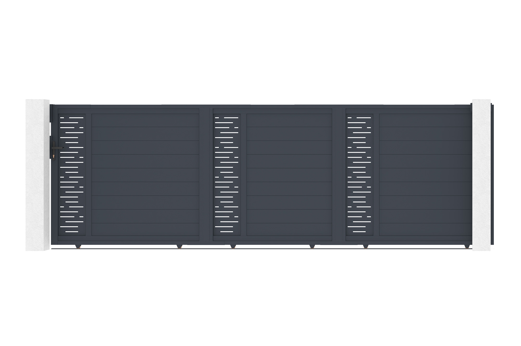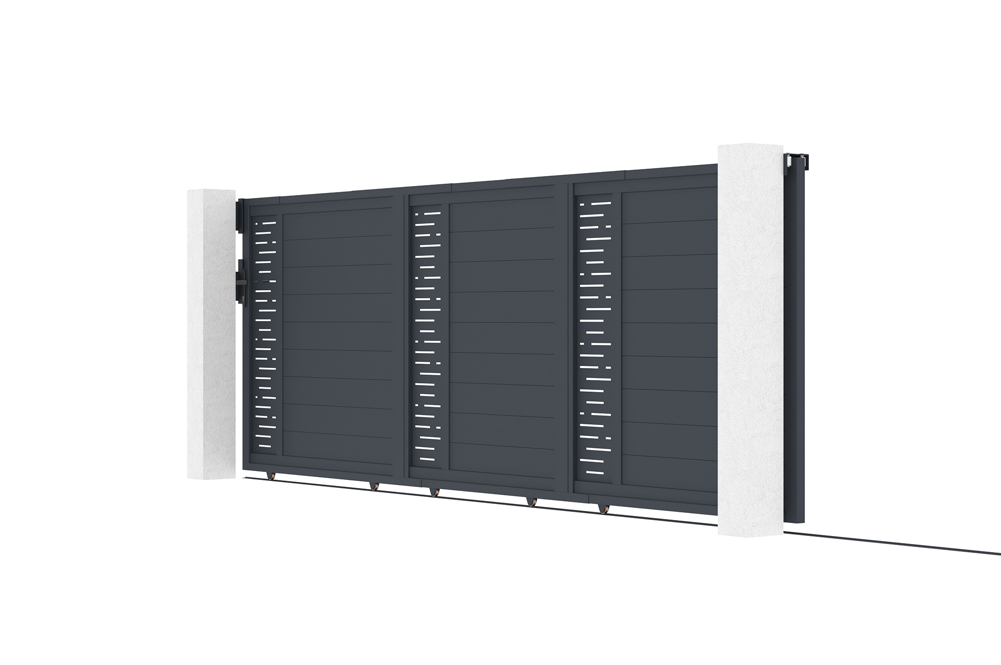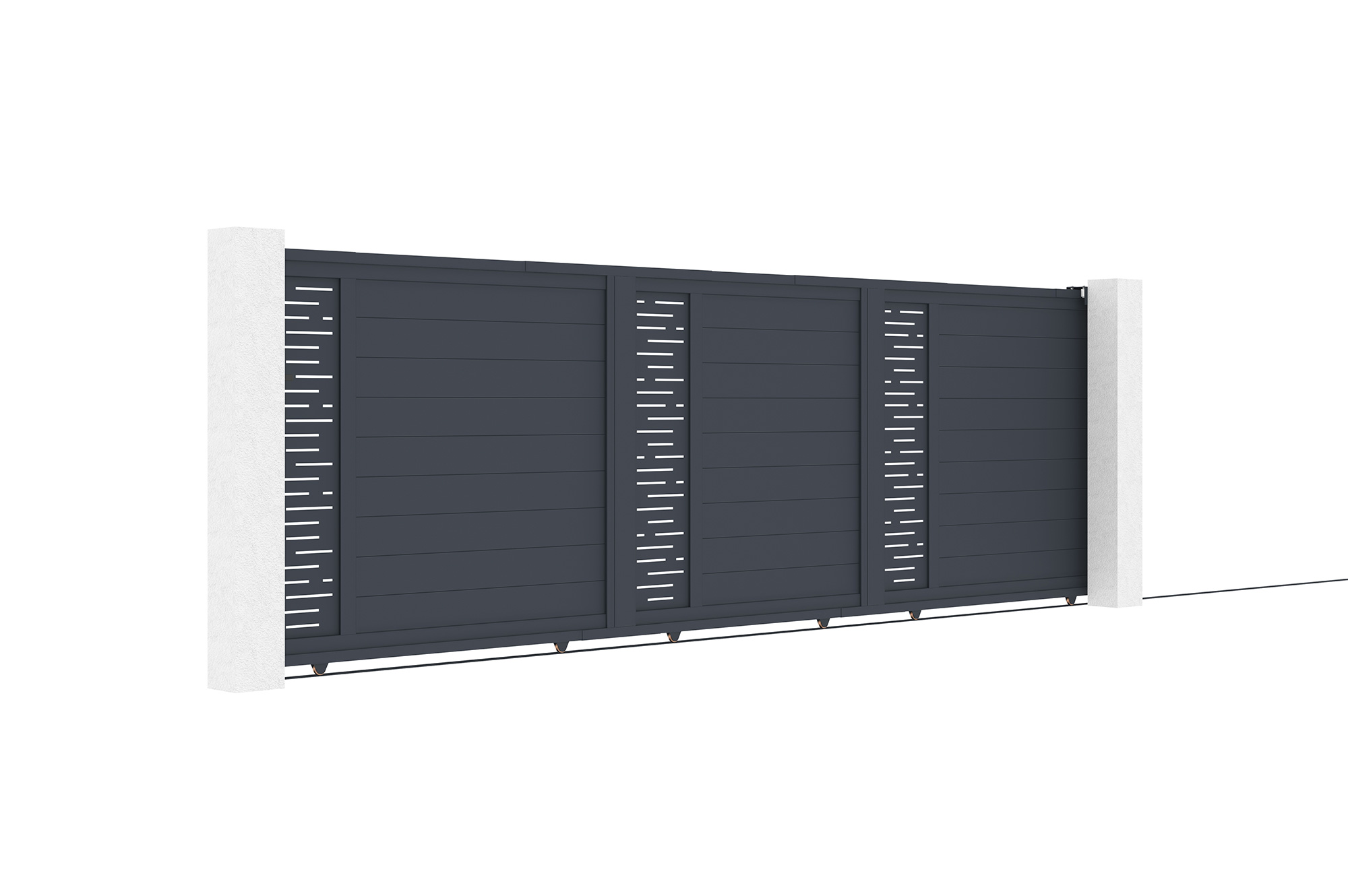 Découvrez notre portail coulissant XL en aluminium ARLBERG, l’équilibre parfait entre style et fonctionnalité grâce à ses plaques décoratives au motif "Lignes graphiques".