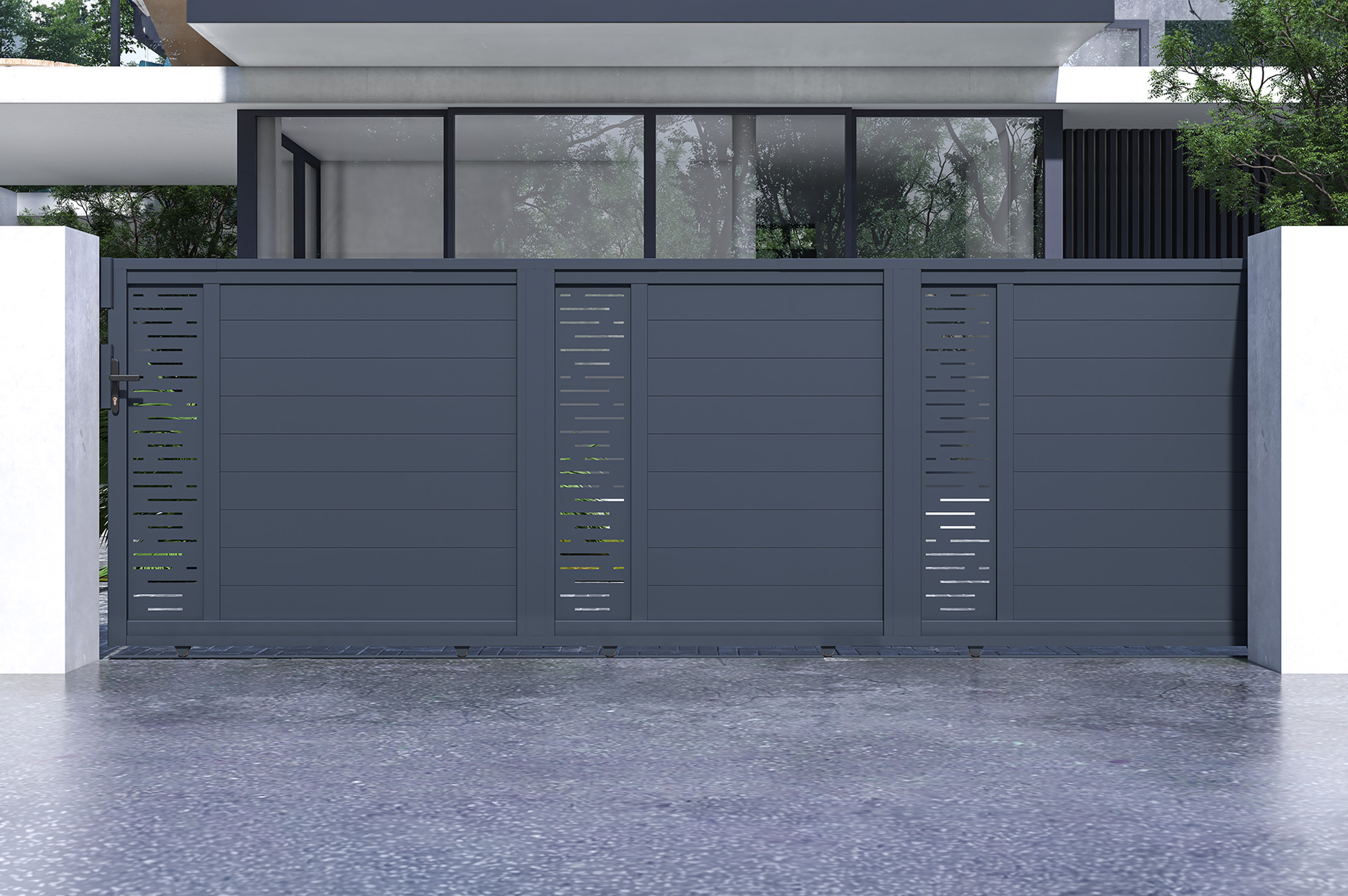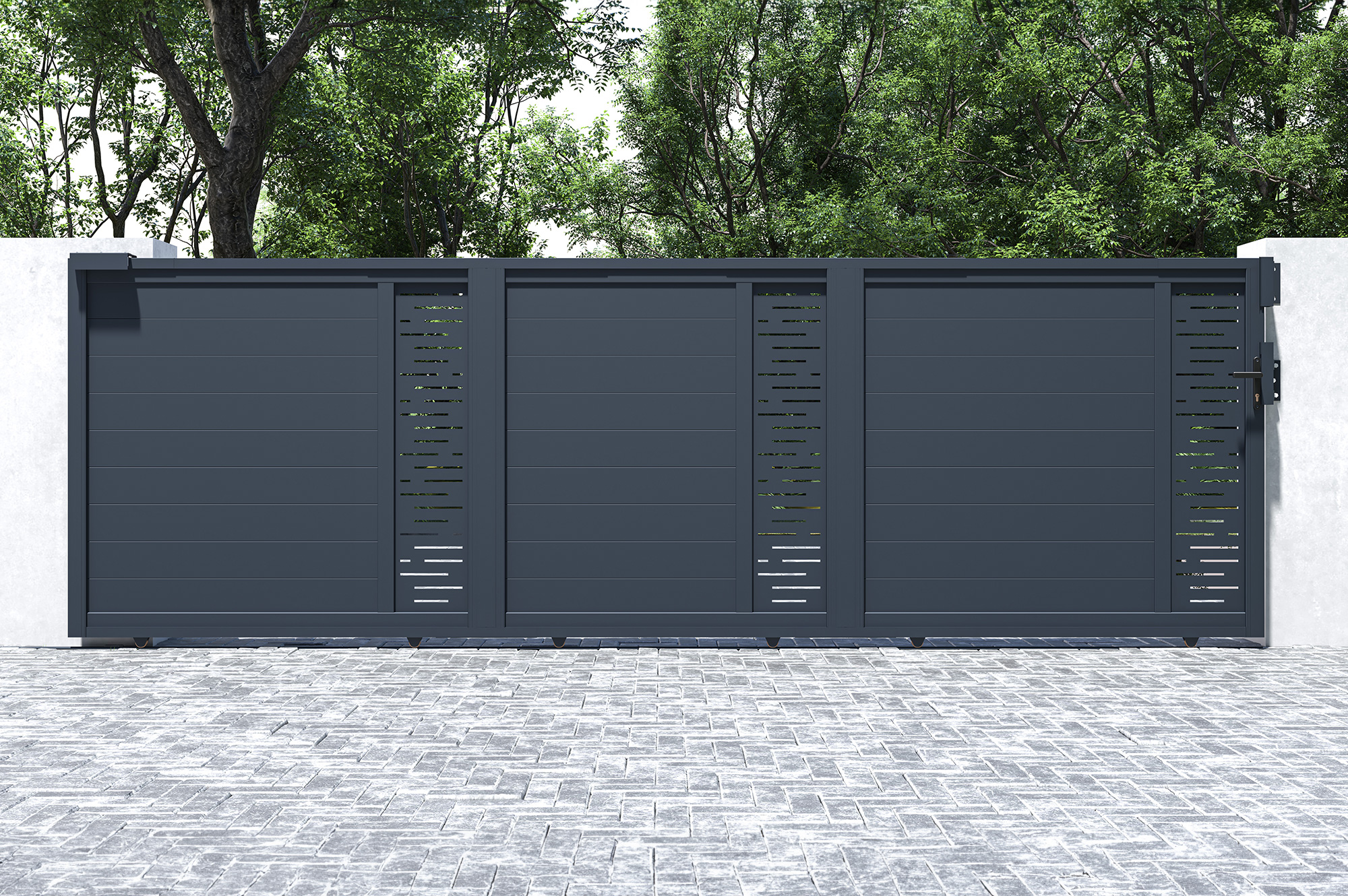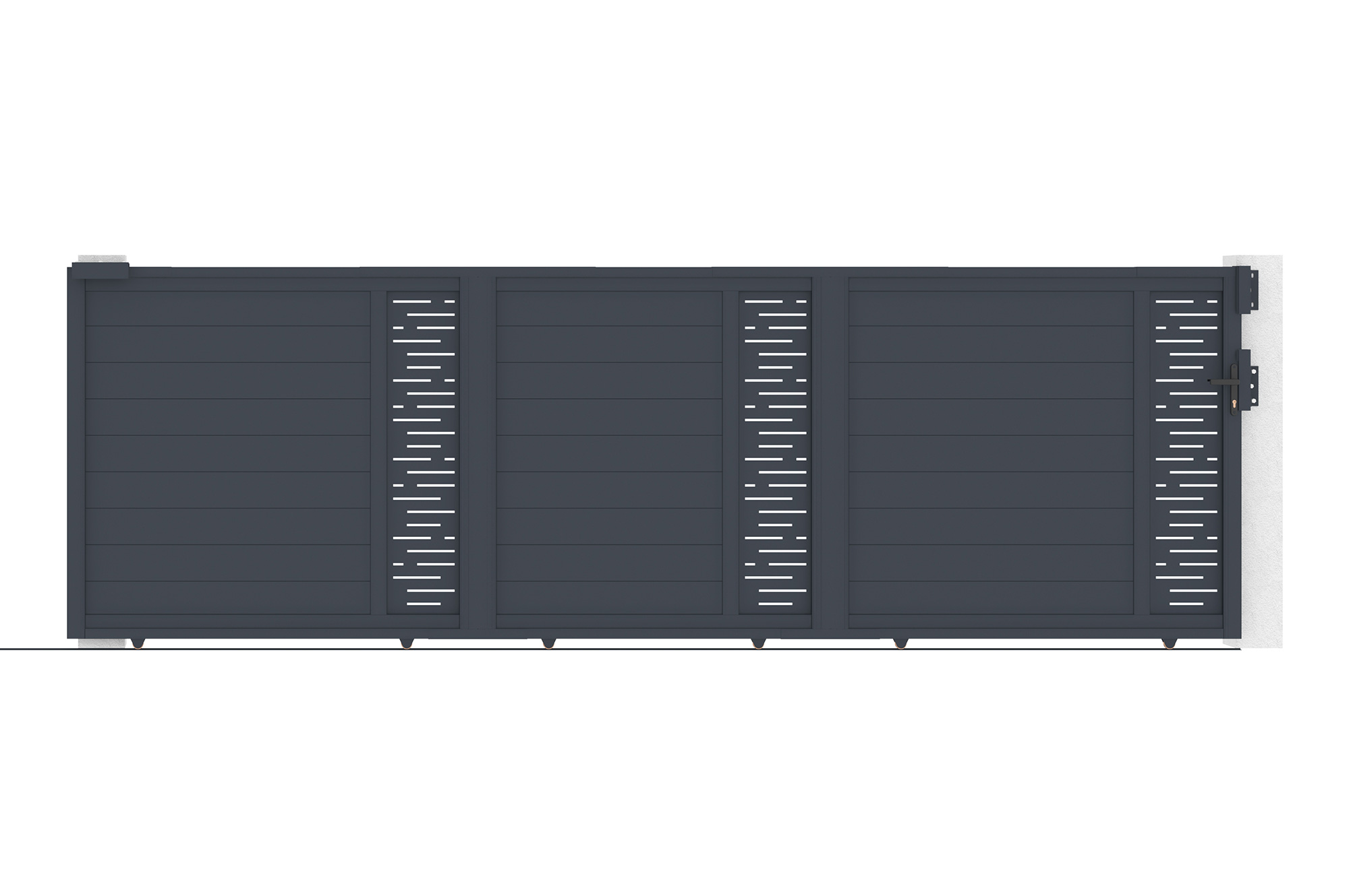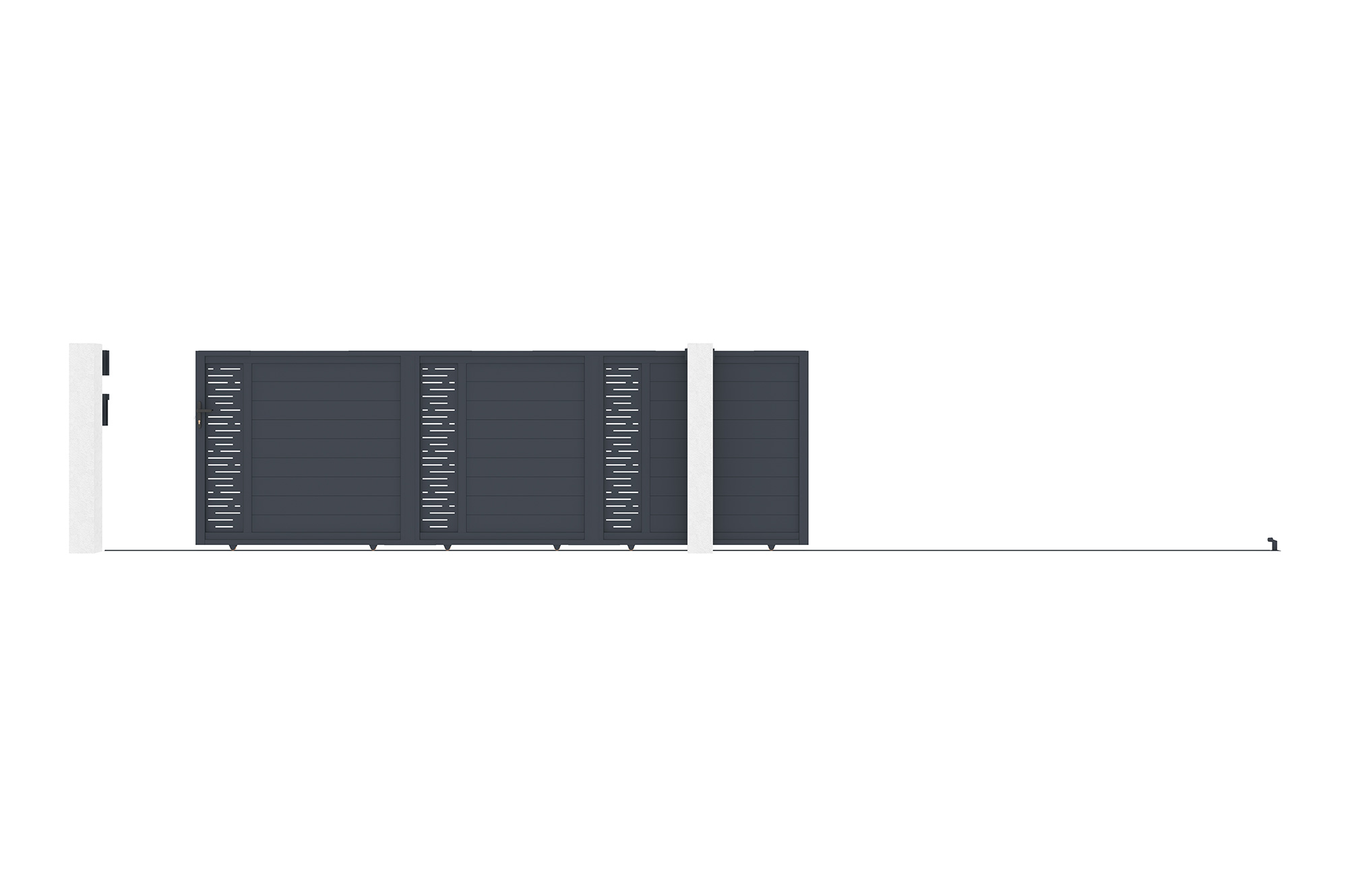 Découvrez notre portail coulissant XL en aluminium ARLBERG, l’équilibre parfait entre style et fonctionnalité grâce à ses plaques décoratives au motif "Lignes graphiques".
