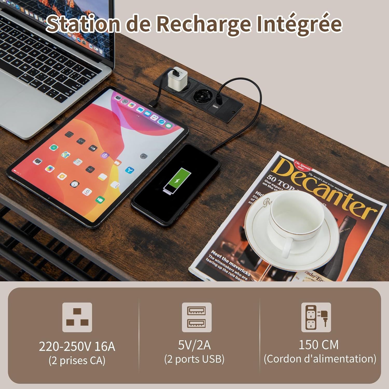 - Station de charge intégrée : Notre table de casier à vin est équipée de 2 prises AC (125V/12A) et de 2 ports USB (5V/2A). Ce design pratique facilite la recharge des appareils électroniques tels que la cafetière, la bouilloire à eau chaude et d’autres accessoires de bar, apportant plus de commodités.