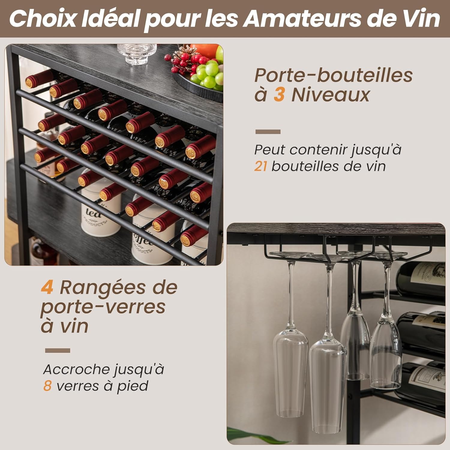 - Conception à 3 niveaux : Notre meuble de bar est conçu avec 3 étagères ouvertes spacieuses, un casier à vin à 3 niveaux et plusieurs crochets afin d’assurer une grande capacité de stockage. Il peut contenir au maximum 8 verres à vin et 21 bouteilles à vin, rendant votre salle à manger bien ordonnée.