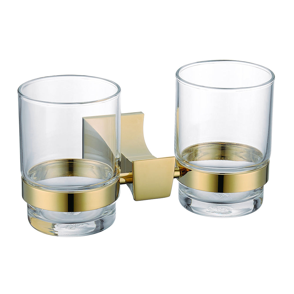 Porte brosse à dents double en laiton doré design, idéal pour compléter votre salle de bain avec goût. Possibilité d'avoir des couleurs assorties avec les autres articles de robinetterie et de douches.