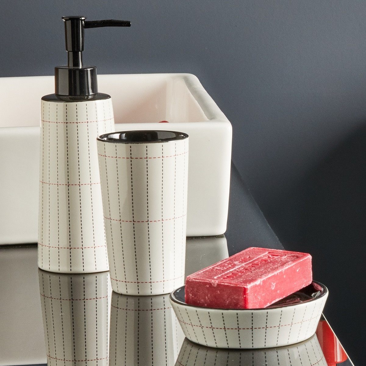 Cette gamme est conçue pour transformer vos accessoires de salle de bains en objet de décoration. Ce gobelet est conçu en céramique avec intérieur noir et motifs rayés.