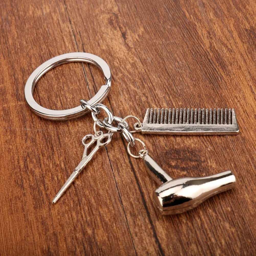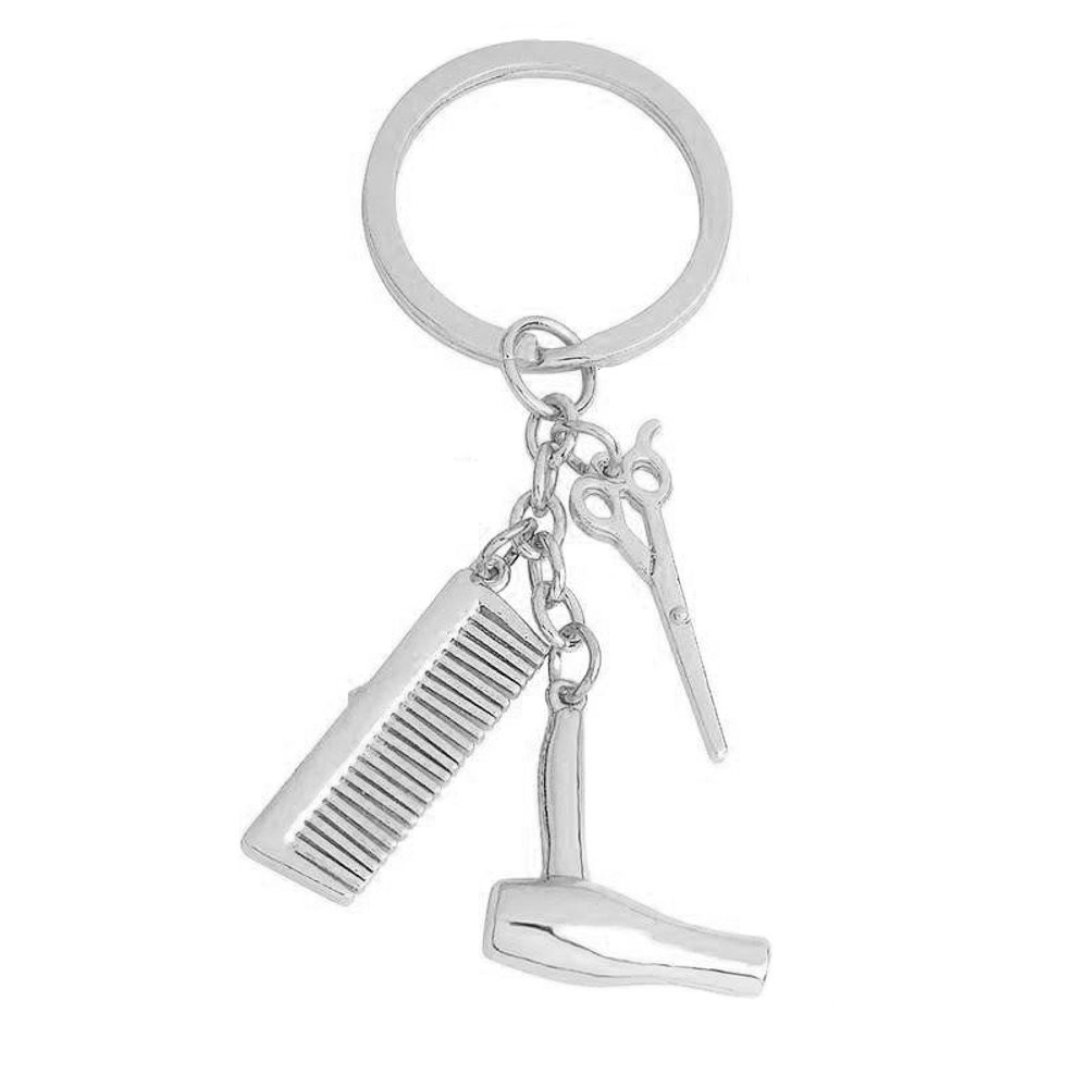 Porte-clés 3 pendentifs thème coiffure peigne, sèche-cheveux et ciseaux, outils de coiffeurs argenté