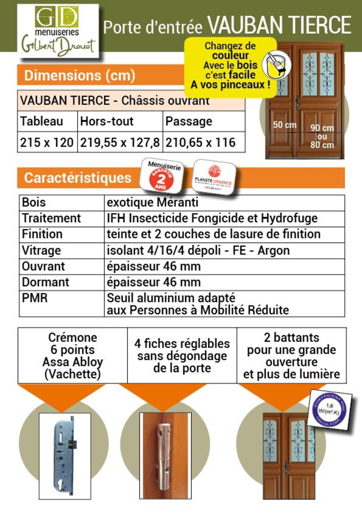 | Libellé | Porte d'entree Bois Tiercee vitree Vauban H215 x L120 p,gauche Cotes Tableau |
