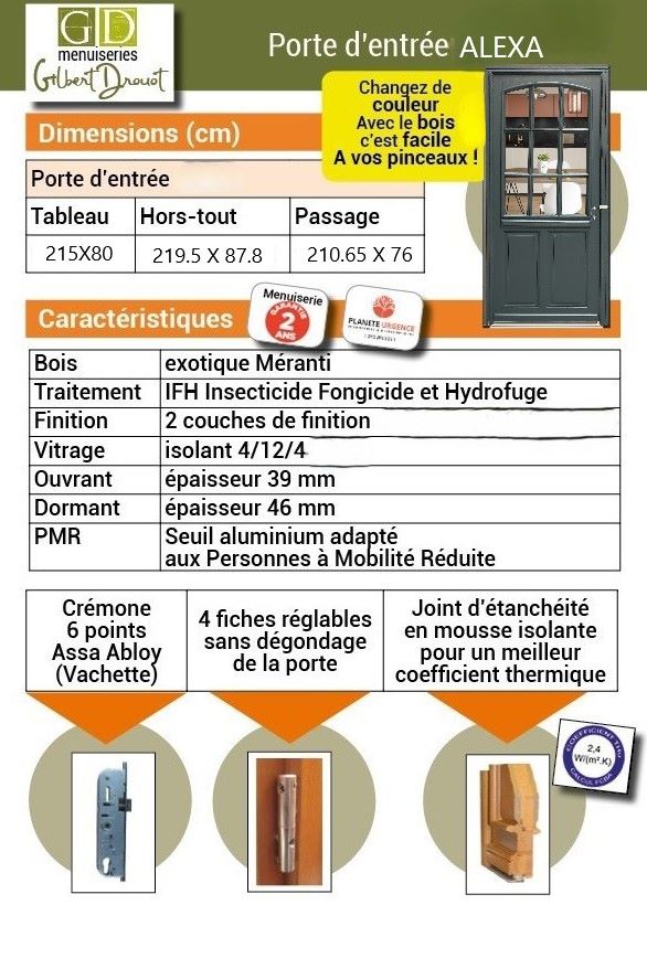 | Libellé | Porte d'entree Bois vitree, Alexa RAL 7016, H,215xl,80 p, droit Cote Tableau |