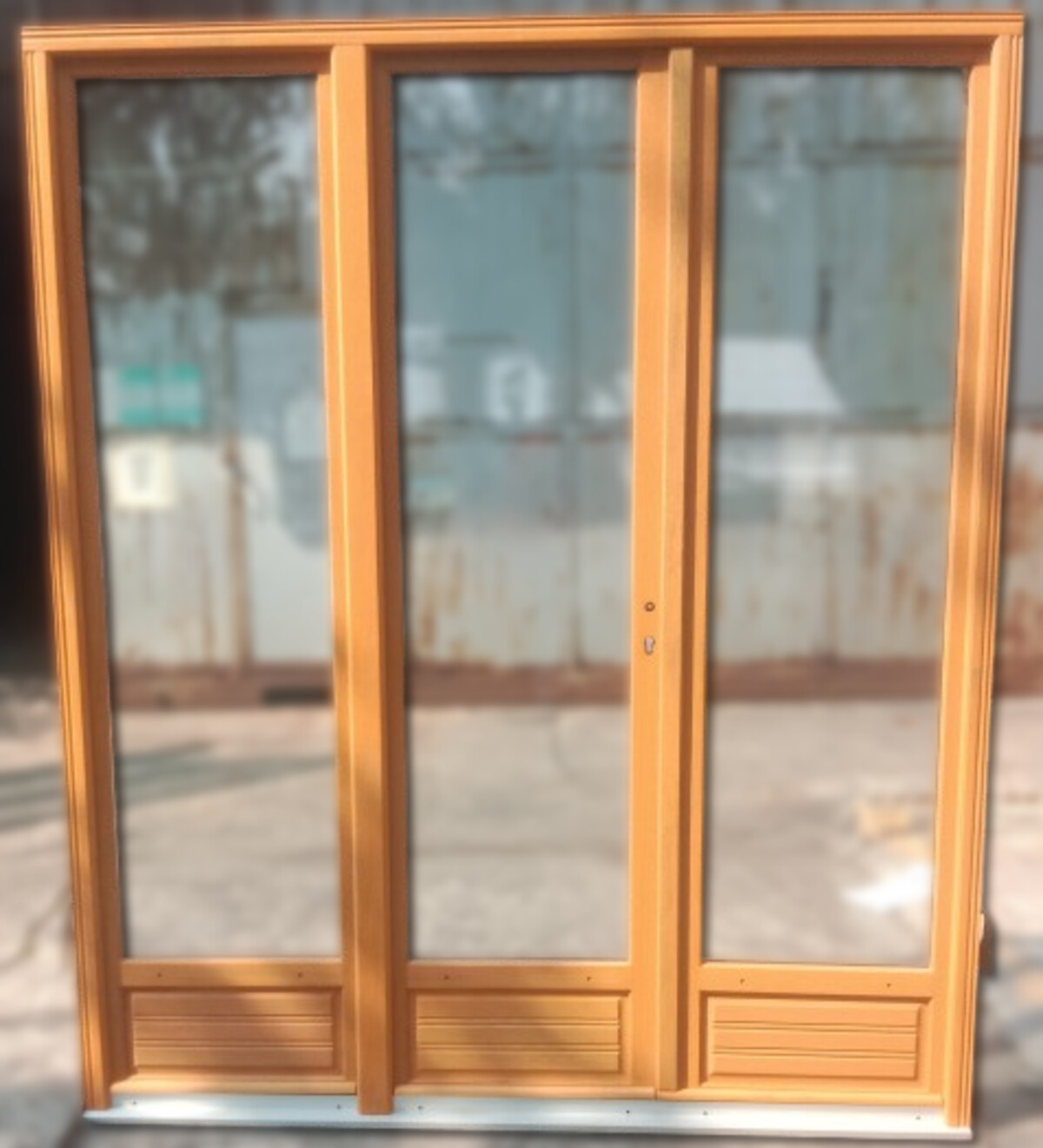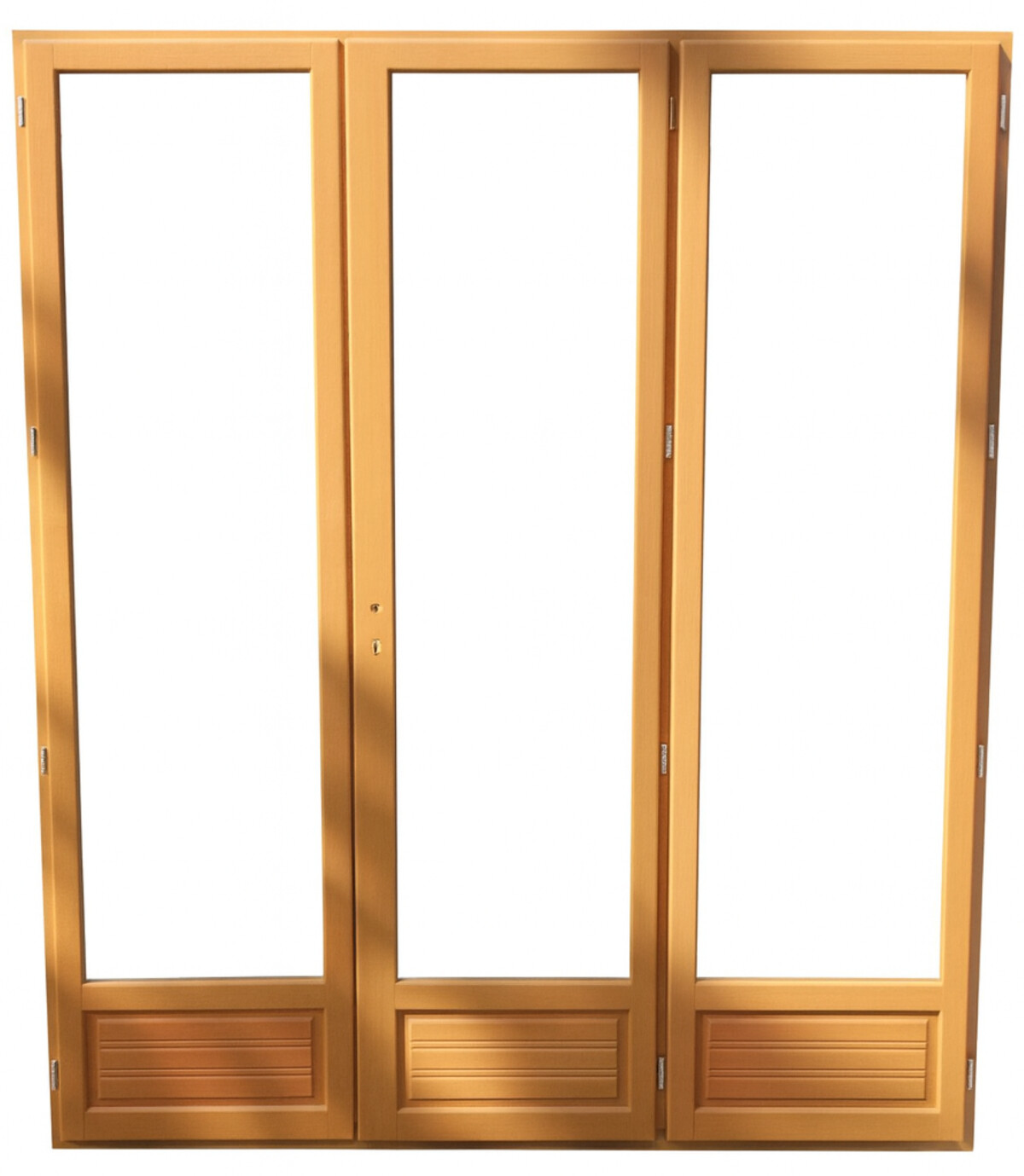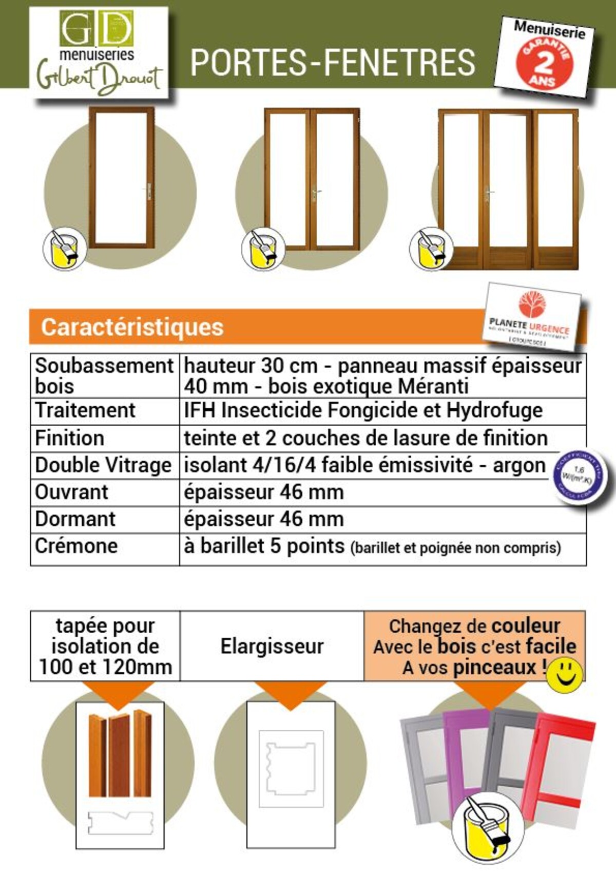 porte fenêtre 3 vantaux en bois (MERANTI);les cotes indiques dans le titre sont les Côtes Tableaux.Pour les cotes hors tout, il faut rajouter 2,6 CM aLA HAUTEUR ET 5,3 CM aLA LARGEUR.Dormant et ouvrant de 46mm d'épaisseur;vitrage 4/16/4 faible émissivité avec gaz argonSoubassement panneau massif epaisseur 40mm adouble plates-bandes pose en rainure avec le meme joint interieur et exterieur que le vitrage.Battant Crémone section 46x83mm.Crémone abarillet 5 points sur les portes-fenêtre barillet et poignee non compris.Ces menuiseries re aÃÂçoivent en usine un traitement FIH.ce premier traitement doit recevoir obligatoirement 2 couches de finition après la pose pour assurer une bonne protection.Faire par la suite un entretien regulierVous pourrez egalement peindre votre fenêtre de la couleur de votre choix pour l'assortir à votre maison. Le Groupe de GD Menuiseries adhere aPLANETE URGENCE et participe al operation 1aàÃÂÃÂàÃÂì = 1 arbre plante