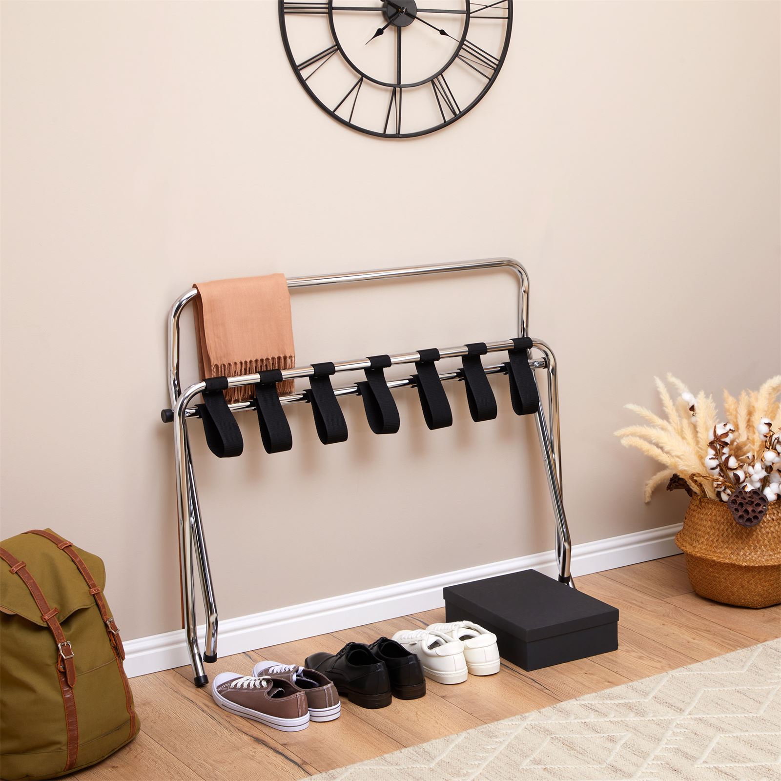 ... représente l'accessoire de rangement idéal pour votre espace de vie, que ce soit à la maison, dans un gîte, ou même dans un hôtel. Avec ses 7 bandelettes de support, il offre une solution pratique pour organiser vos affaires de voyage. Que vous ayez deux petites valises à poser ou une grande valise à ranger, ce porte-valise répond à tous vos besoins. En plus de sa fonction principale, il constitue un support pratique pour sacs-à-main, serviettes, draps et plus encore. Les quatre pieds sont munis d'embouts en caoutchouc, offrant une protection supplémentaire à votre sol pour d'éventuelles rayures.