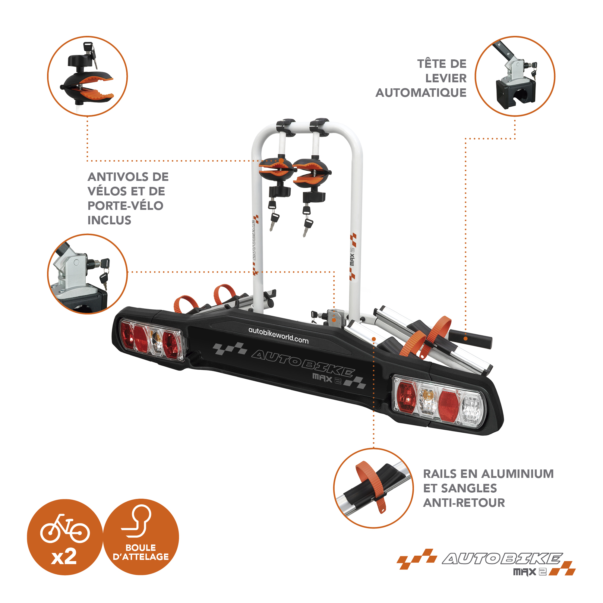 PORTE-VÉLO AUTOBIKE MAX 2 pour 2 vélos, balle de remorquage, levier avec fermeture sécurité, châssis acie