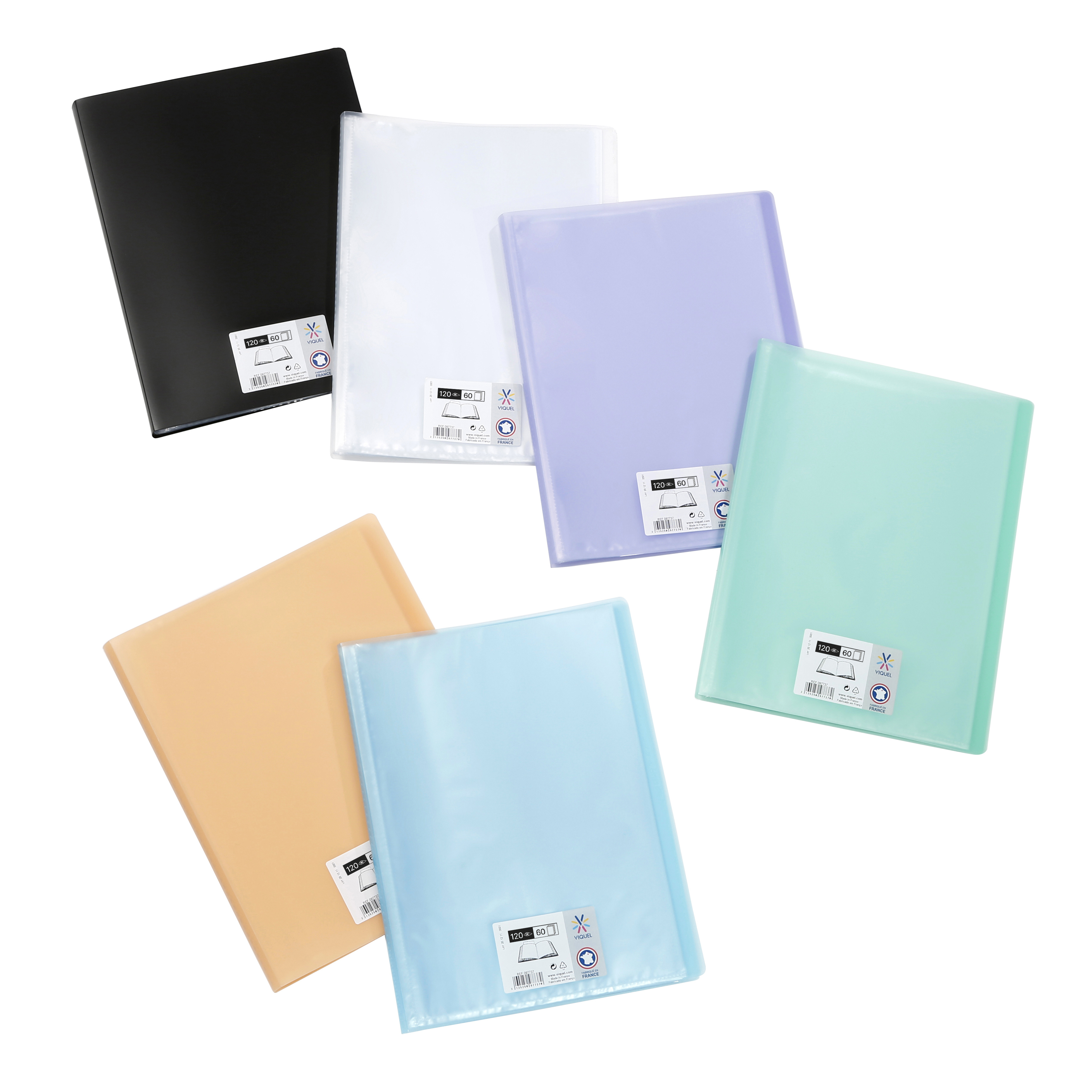 Porte Vues 120 Vues A4 en Polypropylène Opaque et Translucide Ouverture 180° Pochettes Cristal Lisse 40µ Polypropylène Opaque et Translucide 5/10è Coloris Assortis : Noir Opaque et Incolore -Bleu-Lavande-Vert-Pêche translucide Fabriqué en France