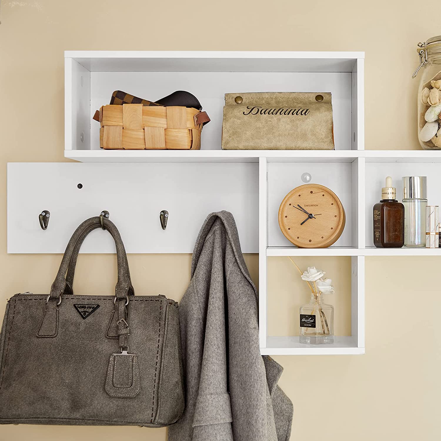 Le porte-manteau chic dispose de 4 crochets en métal pour vestes, manteaux, sacs à main et bien plus encore dans l'entrée. Les 5 compartiments peuvent mettre des décorations ou des plantes vertes pour décorer votre maison.
