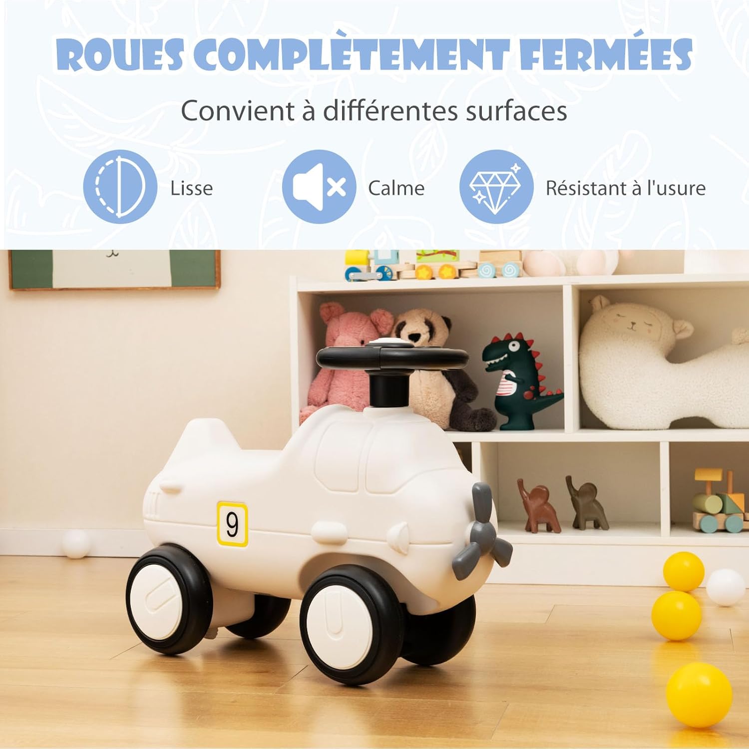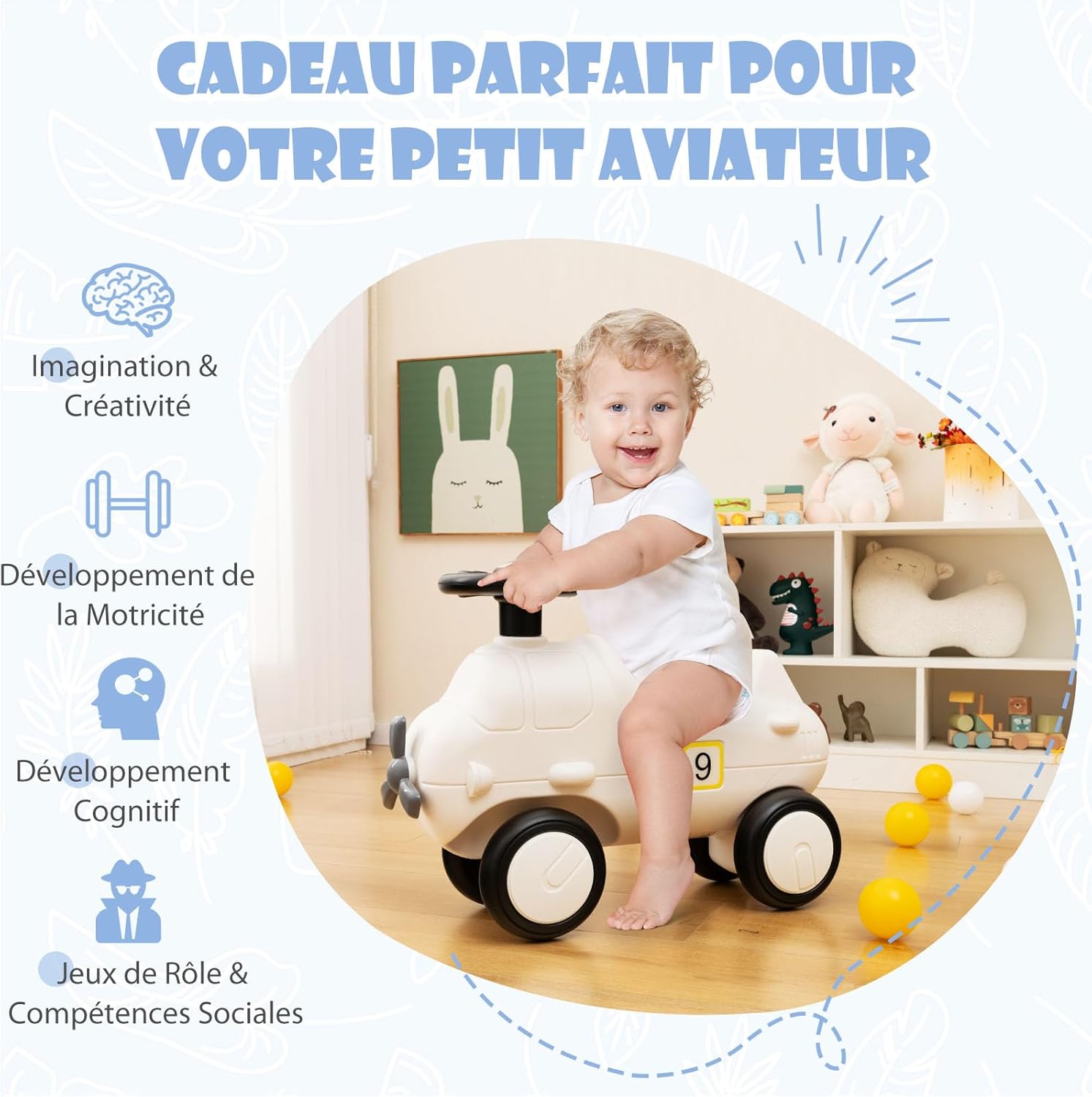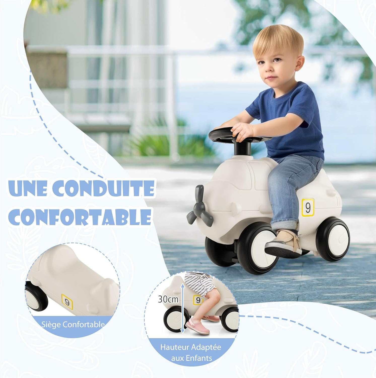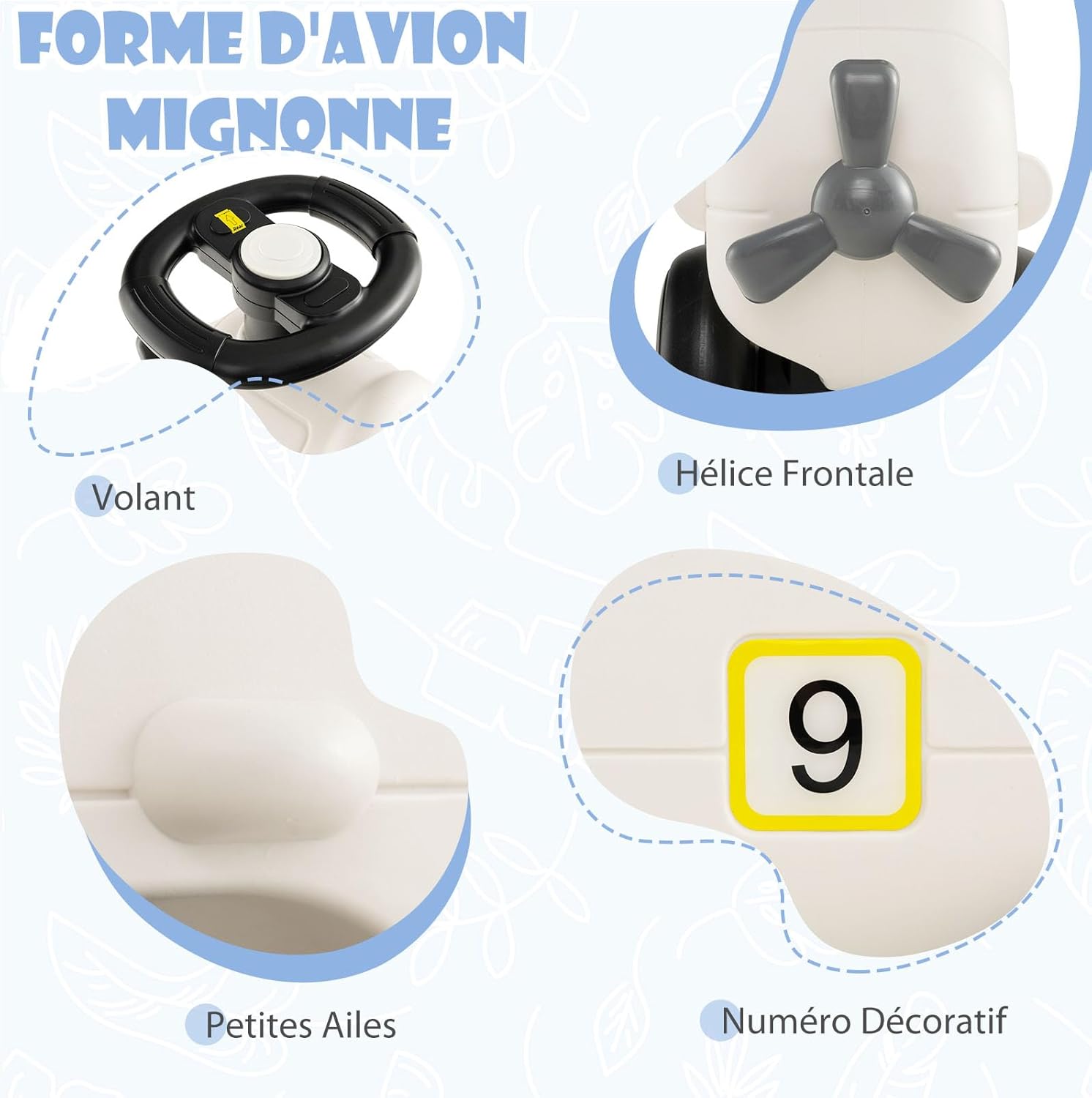 - Adorable et raffiné : Cette adorable voiture autoportée présente un charmant design d'avion qui laisse libre cours à l'imagination de votre enfant. Des hélices réalistes aux petites ailes, en passant par les grandes fenêtres et le chiffre 9, chaque détail a été conçu pour donner vie à une expérience de jeu incroyable pour votre enfant.