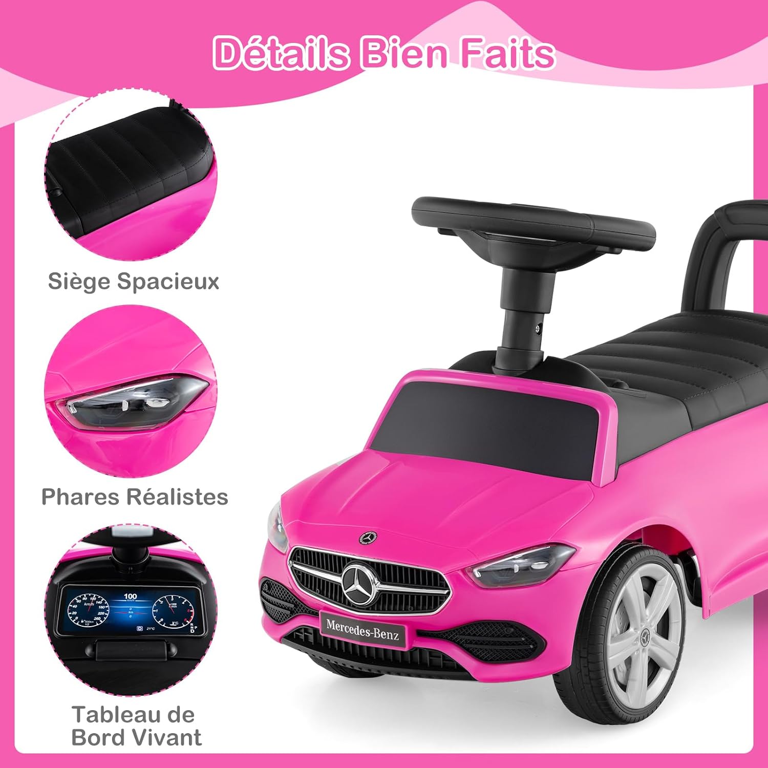 | Libellé | Porteur enfants, voiture à pousser mercedes-benz, volant, klaxon et bruit de moteur, rangement siège,rose |