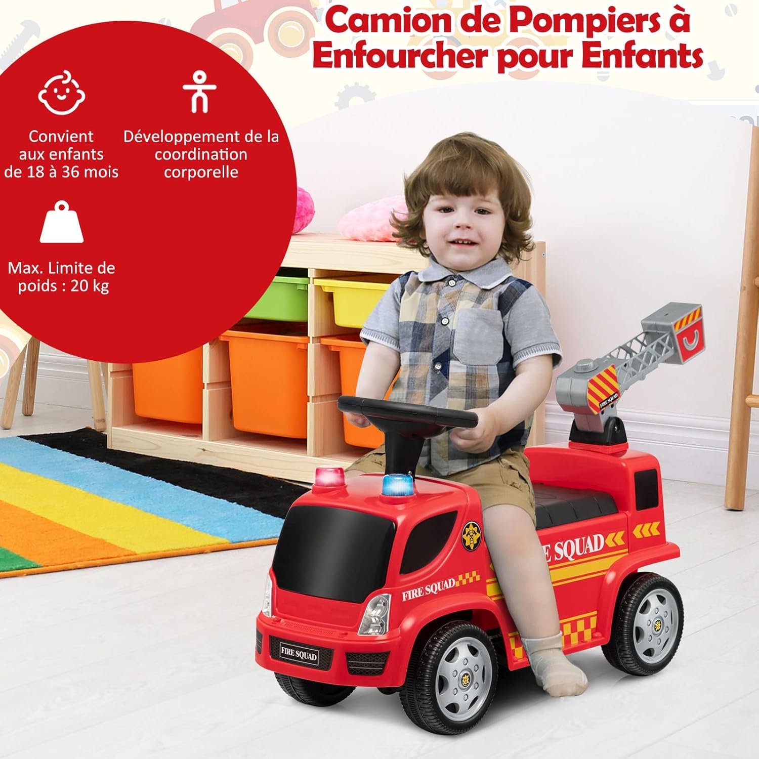 Le siège est large et confortable, les pneus sont antidérapants et résistants aux chocs, il peut s'adapter à toutes sortes de surfaces intérieures et extérieures, et il peut satisfaire pleinement les besoins de conduite des enfants, tout en exerçant leurs capacités d'équilibre. Il est plein de détails avec des lumières rouges et bleues réalistes et des autocollants de carrosserie de camion de pompiers. Il est équipé de jets de bulles et possède également un bouton musical pour émettre des sons, tout cela pour que l'enfant se mette dans la peau d'un pompier et s'amuse.
