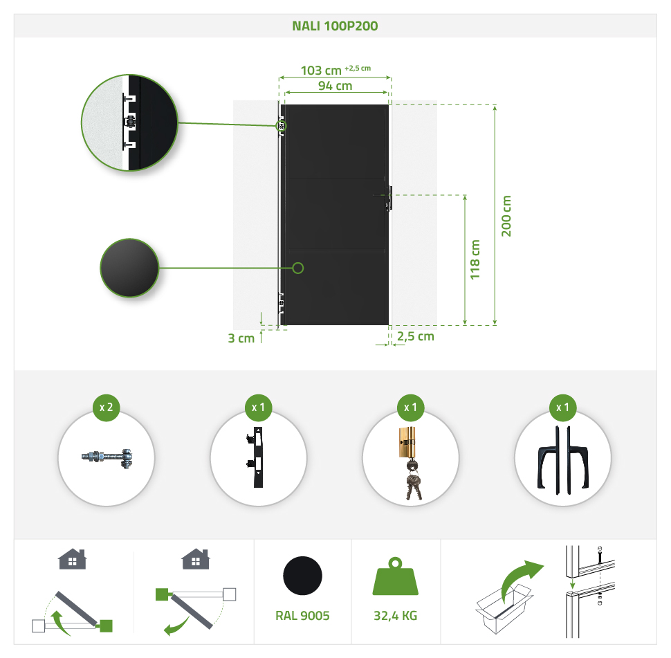 Libellé Portillon acier 1m NALI H.200cm Noir mat, Anti-effraction Serrure et Clé Incluses