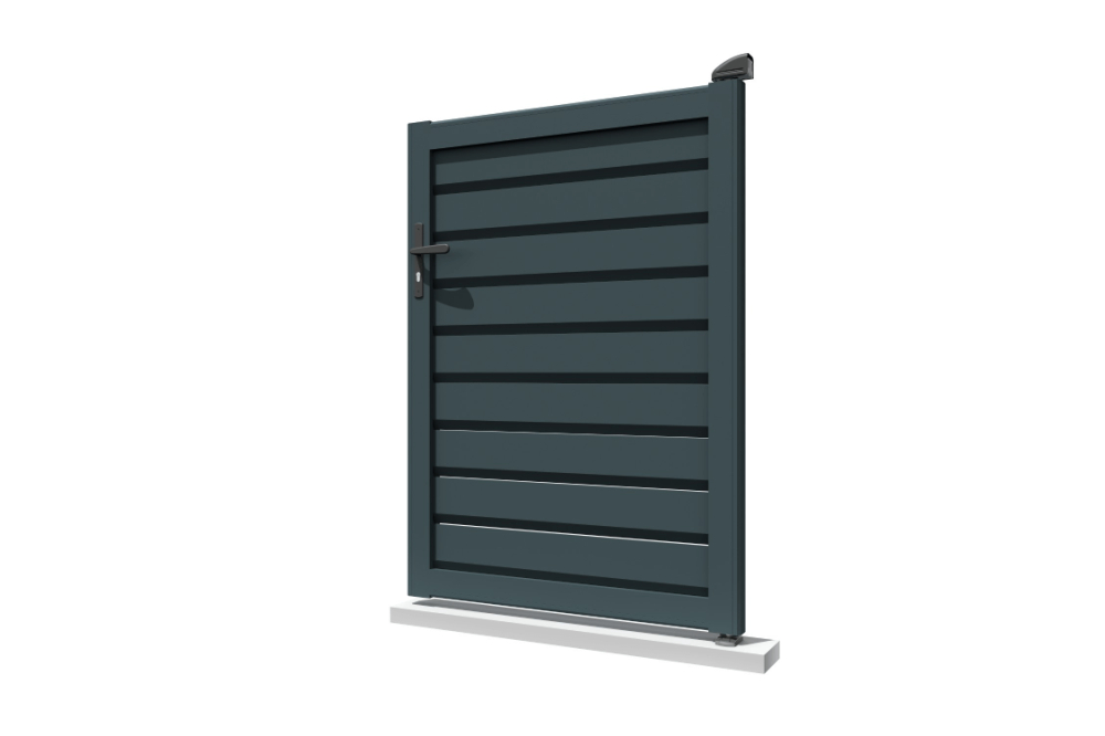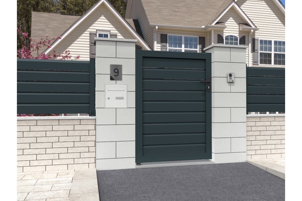 Portillon battant à panneau brise-vue. Montage rapide et facile. Coloris Gris anthracite. Fabrication française en aluminium thermolaqué de haute qualité. Fixation avec gonds. Livraison en kit prêt à poser. Serrure et poignée fournies. Largeur 1000mm x Hauteur 1707 mm.