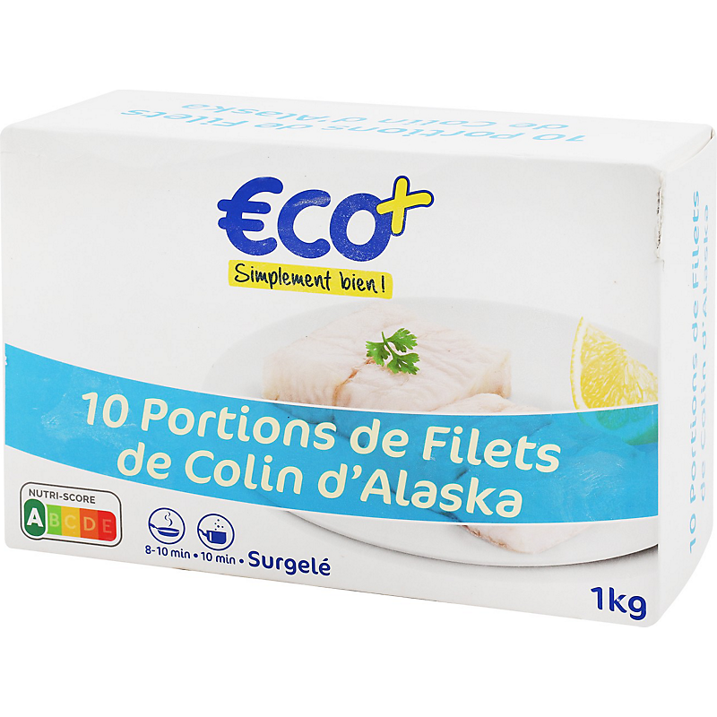 PORTIONS DE FILETS DE COLIN D'ALASKA* (THERAGRA CHALCOGRAMMA) PÊCHÉ AUX CHALUTS EN OCÉAN PACIFIQUE NORD-OUEST (A**) OU EN OCÉAN PACIFIQUE NORD-EST (B**), SURGELÉES. *Qualité sans arête : bien qu'un soin tout particulier ait été pris pour éliminer toutes les arêtes, quelques-unes peuvent exceptionnellement se retrouver dans ce produit. ** La lettre située dans l’encart sur le côté de l’étui correspond à la zone de pêche. ECO +