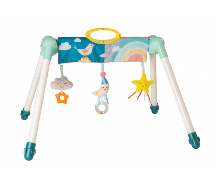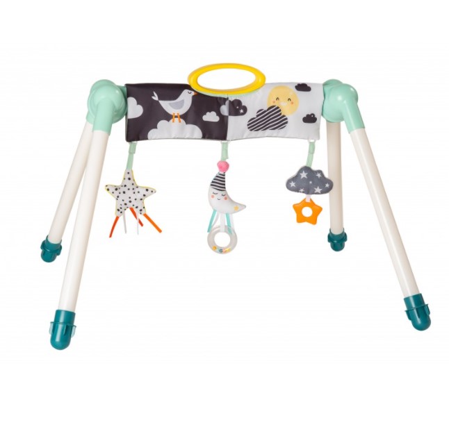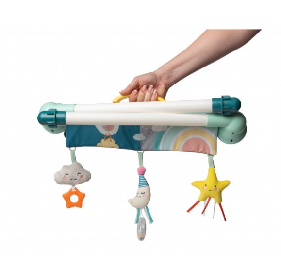 Un portique d'activités pliable pour un transport et un rangement plus pratique. Bébé pourra s'amuser avec les 3 jouets amovibles double face: une lune avec carillon, une étoile et un nuage.