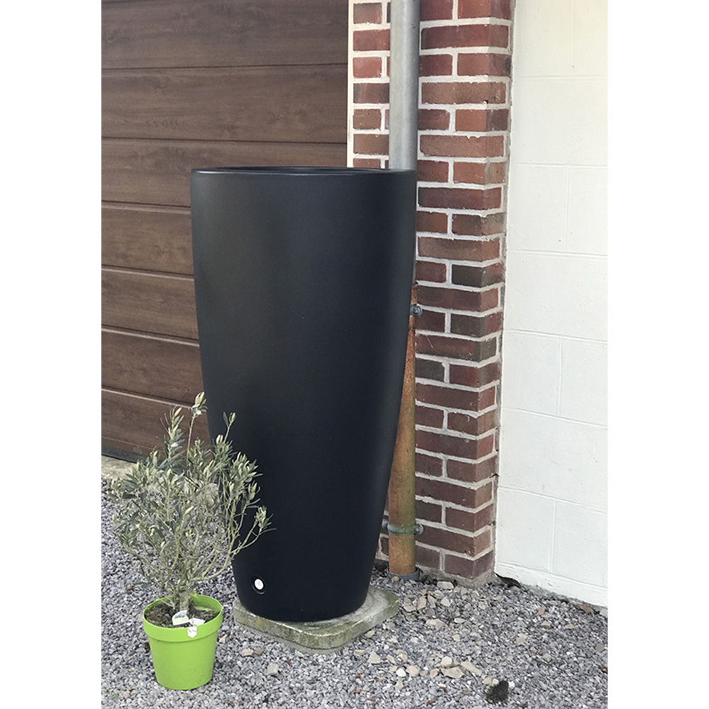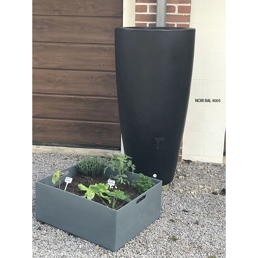 Capacité de récupération eau de pluie: 200L_ Longueur : 60 cm_Hauteur : 121 cm_ Largeur : 60 cm._Poids : 12kg_ Pour récupérer les eaux de pluie depuis une goutiere_ Pour usage décorartif_Matière : polyéthylène haute densité (contact alimentaire ) équipé d'un robinet PEHD noir et un bouchon de vidange blanc_Pot très résistant aux chocs. plage d'utilisation : -30°C à +60°C_ 100% recyclable_Traité anti UV_Finition graineé_Marque : PLAST'UP ROTOMOULAGE_Fabrication Française