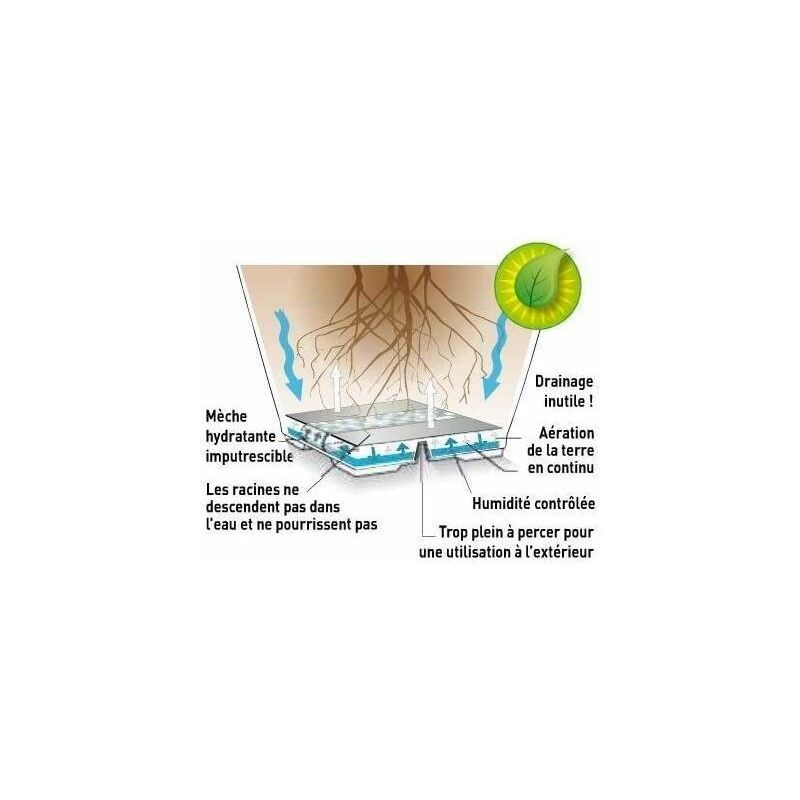 | Informations complémentaires | Réserve d'eau. Contrôle visuel du niveau d'eau. Possibilité d'ajouter un support roulant encastrable et invisible (non inclus). Intérieur ou extérieur (trop plein à percer pour un usage extérieur). Robuste. Protection UV. |