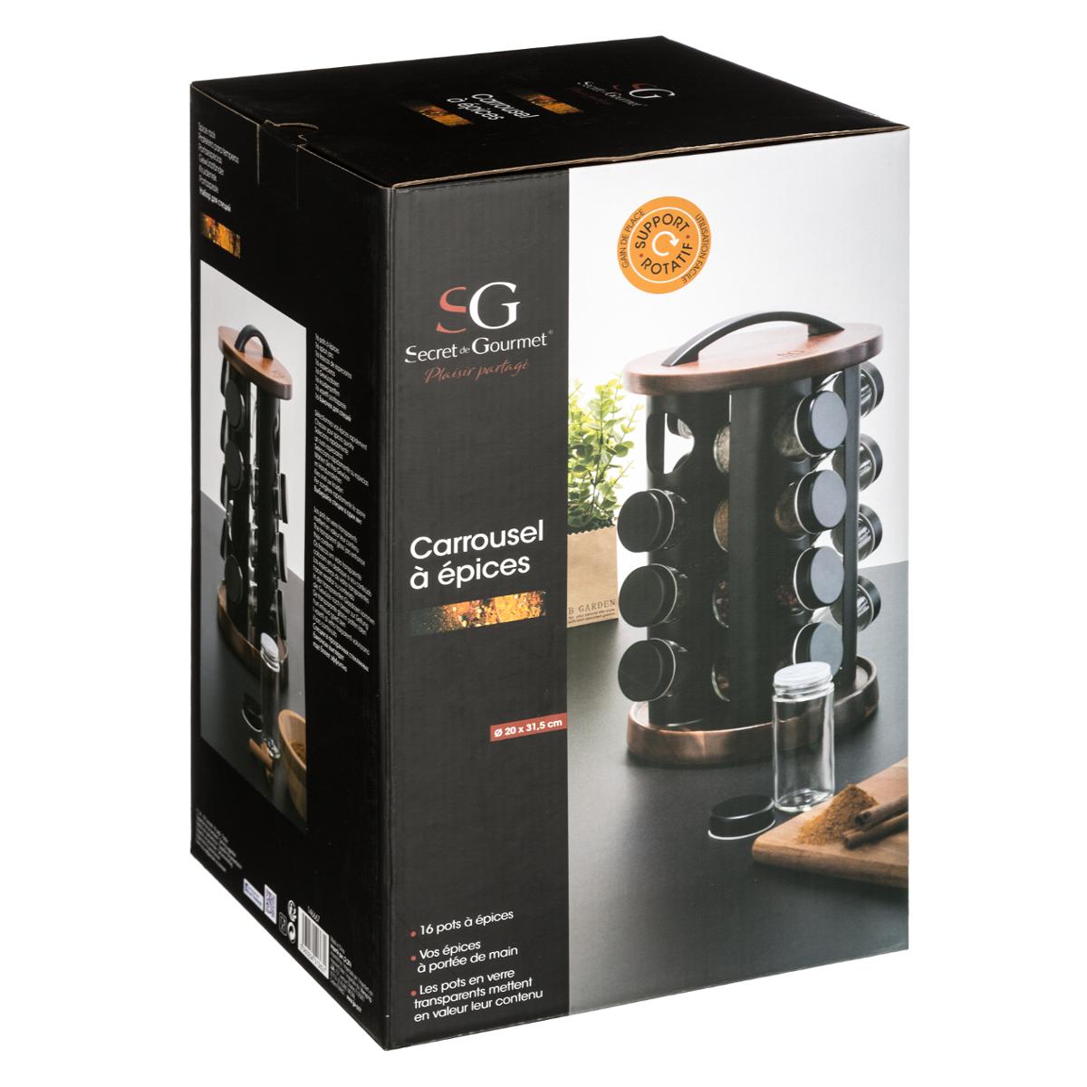 Ce pot à épices rotatif de la marque Secret de Gourmet trouvera facilement sa place dans votre cuisine. Esthétique et fonctionnel, il est doté de 4 supports à épices permettant de ranger 16 pots en verre, livrés avec l'ensemble. D 20 x H 31,5 cm. Poids : 2 ,7 kg. Matières : Acacia, métal et verre.Couleur : NoirDimensions (L x l x H) : 21 x 21 x 31,5 cmMarque : SECRET DE GOURMETMatière(s) : Acacia, ABS, métal, PE et verre