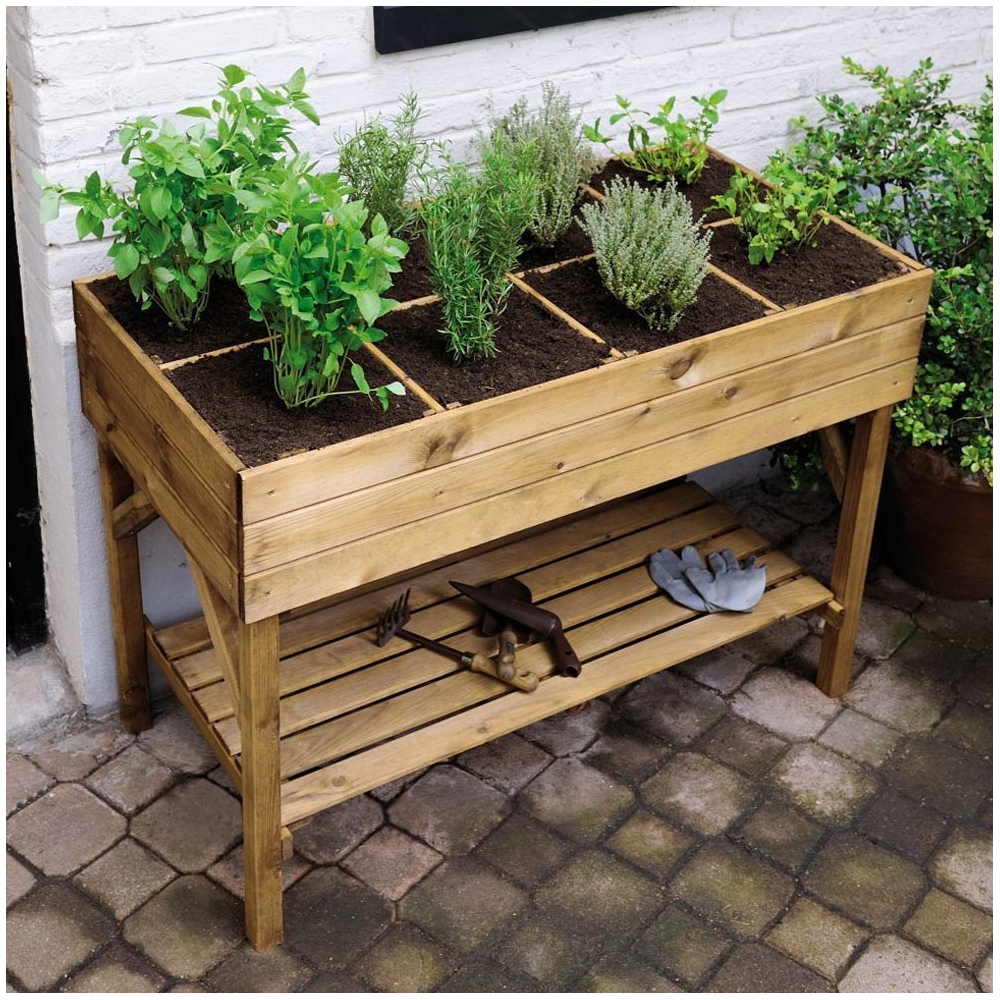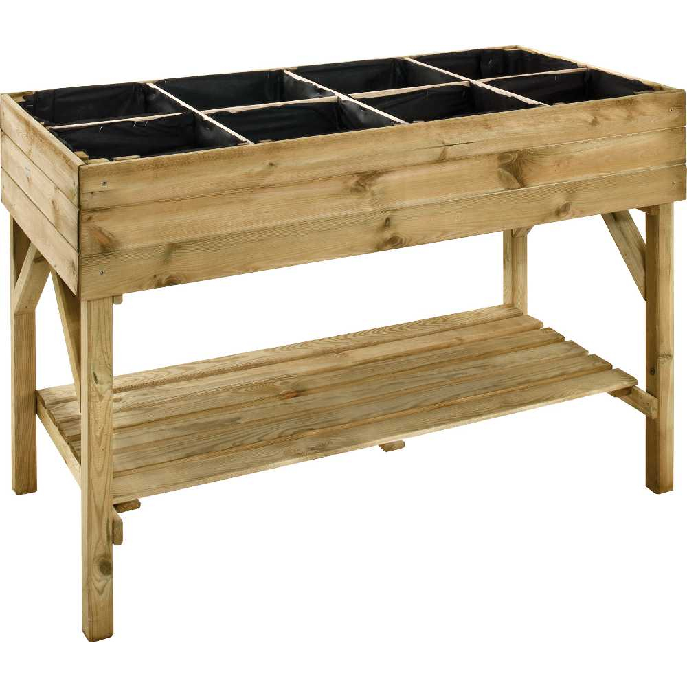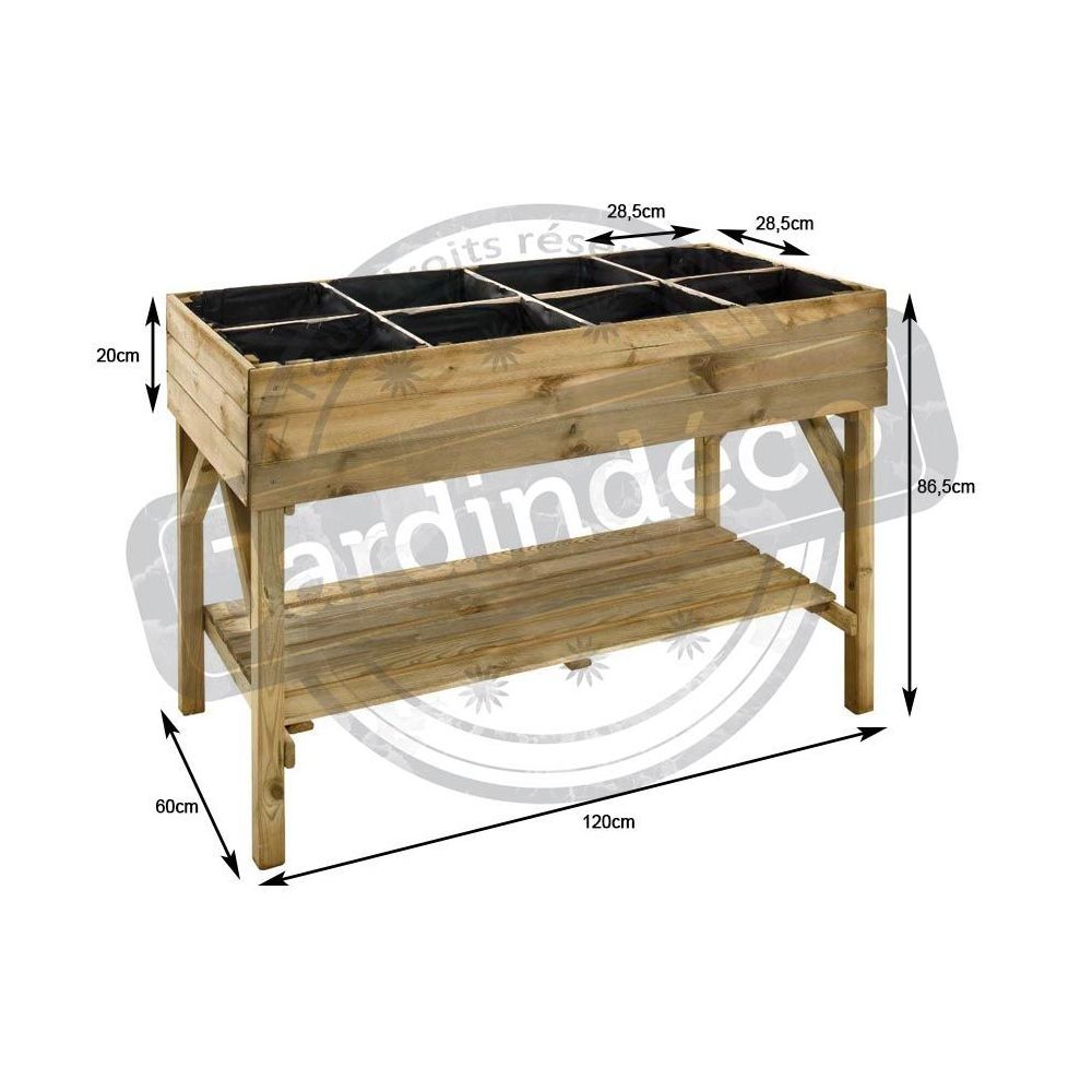 Descriptif:Carré potager avec 8 cases Gariguette - 135 L - 120 x 60 x 86.5 cm - BoisLivré avec géotextile et treillis.Dimensions:Dimensions hors tout : 120 x 60 x 86.5 cmDimensions intérieures :117 x 57 x 20 cm Dimensions treillis : 1.5 x 9 x 57/117 cm Dimensions d'un carré : 28.5 x 28.5 x 20 cm.Surface:Capacité : 135 L.Matériaux:Pin européen traité autoclave classe 3Certification FSC.Base:Epaisseur : 1.4 cm (bac), 1.8 cm (étagère).Poids net:34 kg.Colisage:1 colis : - 1,25 x 0,6 x 0,14 m, 34 kg.
