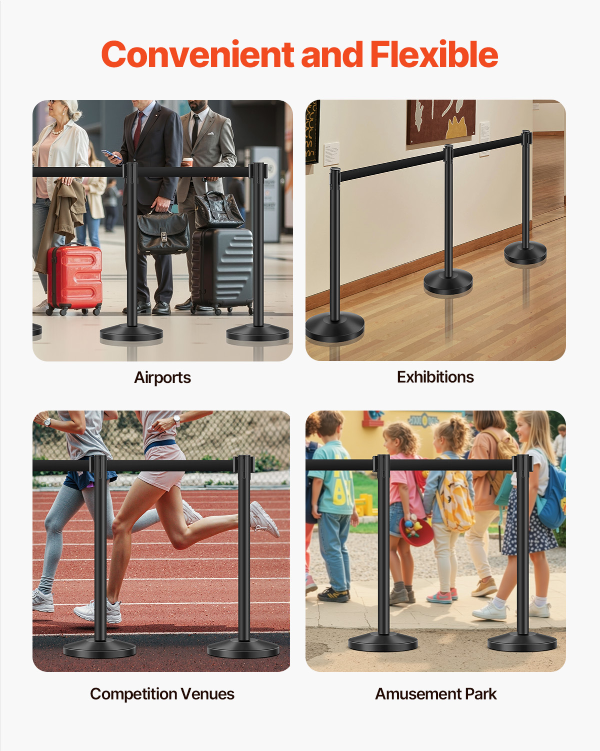 Large couverture : les barrières de contrôle des foules sont conçues avec quatre ceintures rétractables de 6,56 pi/2 m. Il offre une solution flexible et pratique pour la gestion de l'espace, s'adaptant facilement pour répondre aux besoins de divers environnements et événements