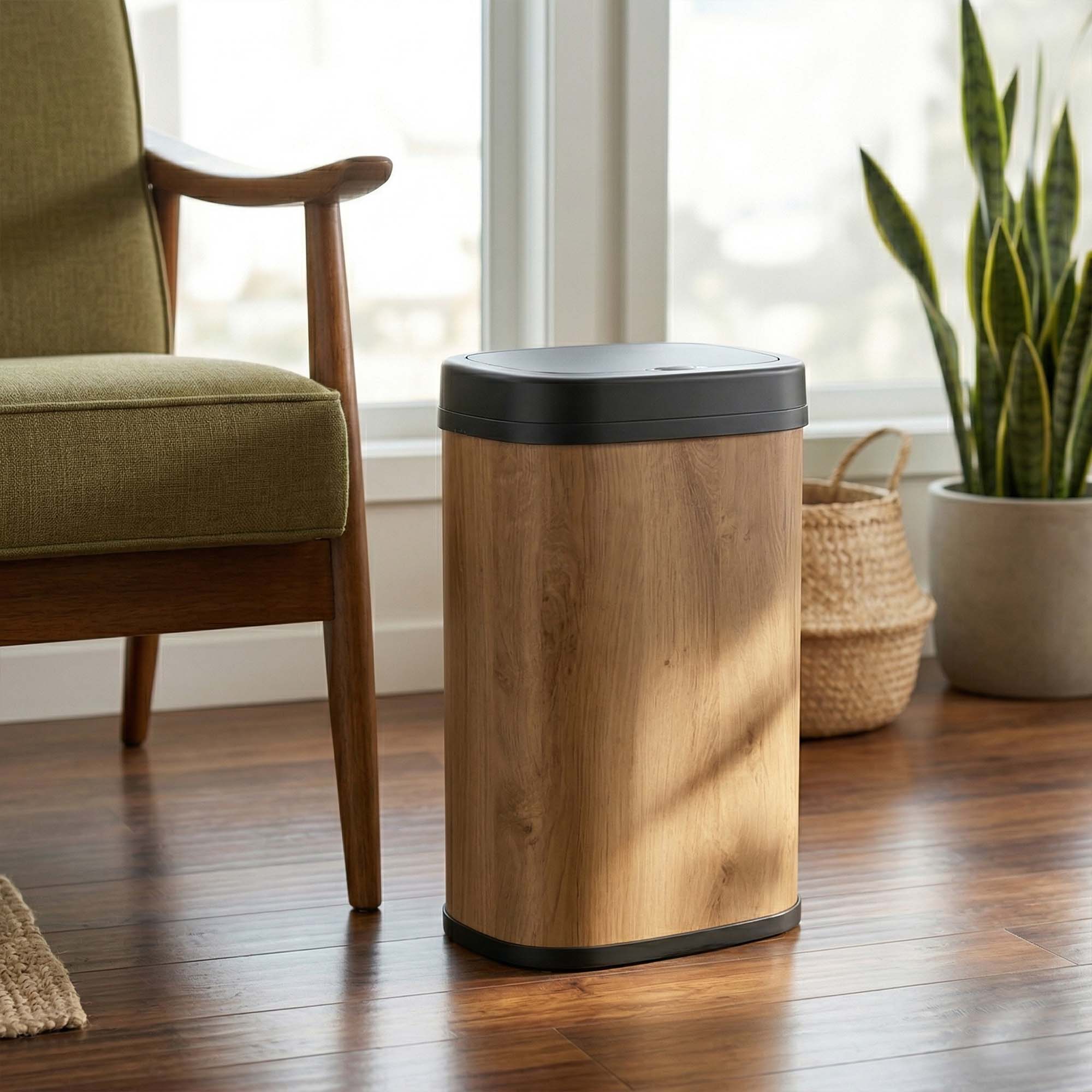 La poubelle automatique MAJESTIC WOOD 58 L de Kitchen Move associe élégance et confort d'utilisation grâce à son design bois et inox brossé. Son capteur infrarouge intelligent permet une ouverture automatique à environ 15 cm, sans contact, pour un usage hygiénique et pratique au quotidien. Sa cuve rectangulaire en acier inoxydable avec effet bois et son couvercle noir en ABS solide apportent une touche naturelle et moderne à votre cuisine. Elle fonctionne avec 4 piles D (non incluses) ou via port USB-C (câble non fourni), pour une alimentation flexible. Son cerclage intérieur maintient efficacement le sac, tandis que l'anneau de protection au sol évite les rayures. Compacte et stable grâce à sa base antidérapante, elle dispose d'une fermeture silencieuse et d'une surface anti-traces facile à nettoyer. Dimensions : 40,9 × 29 × 65,5 cm. Idéale pour les familles, elle combine design, capacité et praticité.