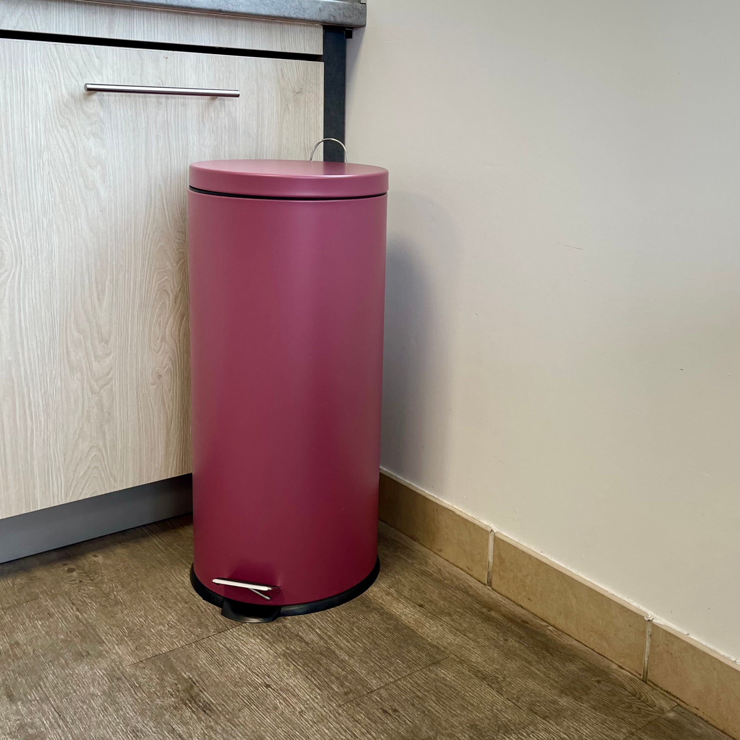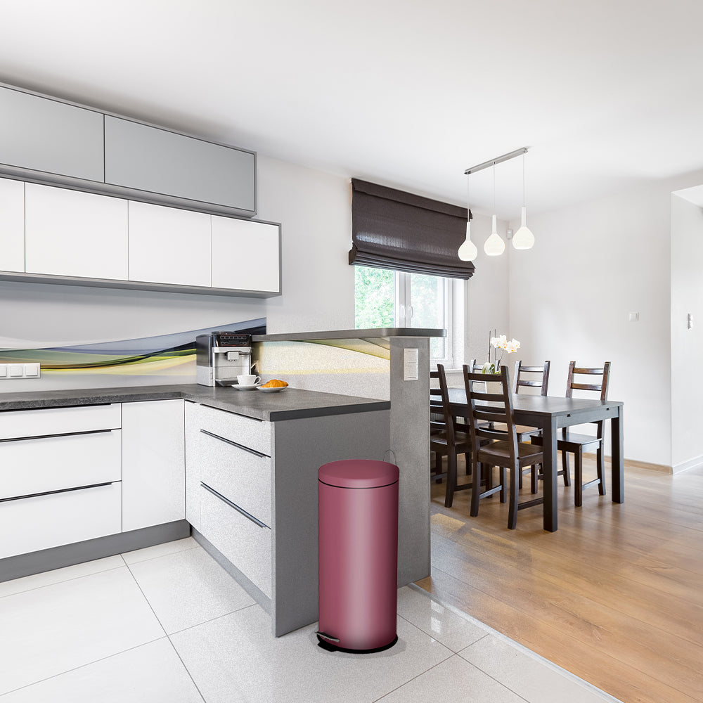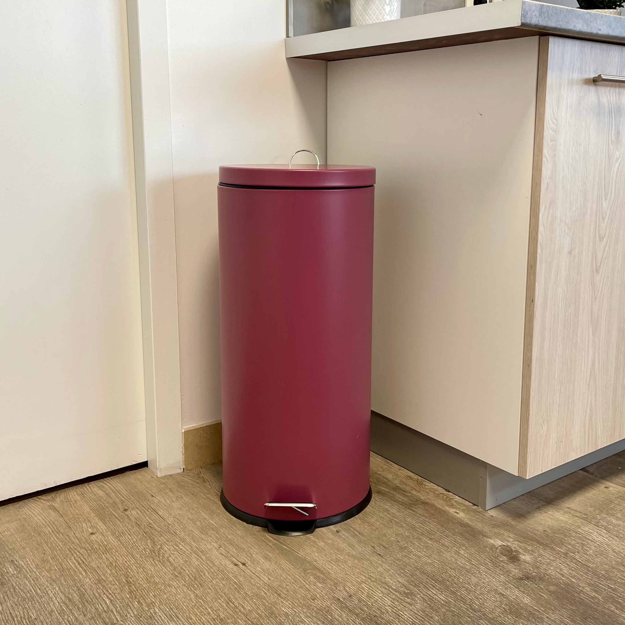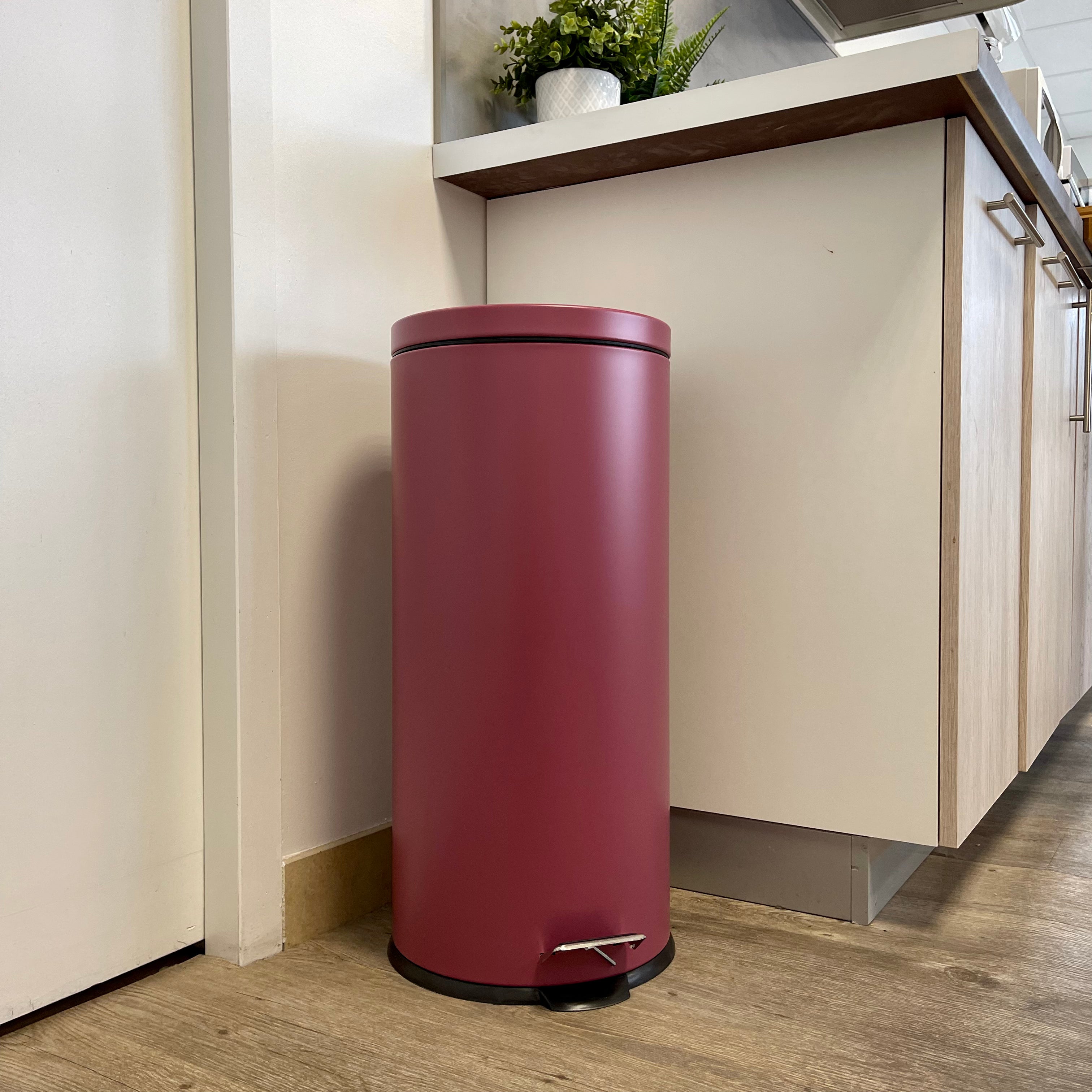 - Poubelle de cuisine à pédale ronde avec seau Capacité 30L modèle URBAN en acier Inoxydable Couleur Rouge bordeaux Dimension: Ø29xH66cm Poids:3kg