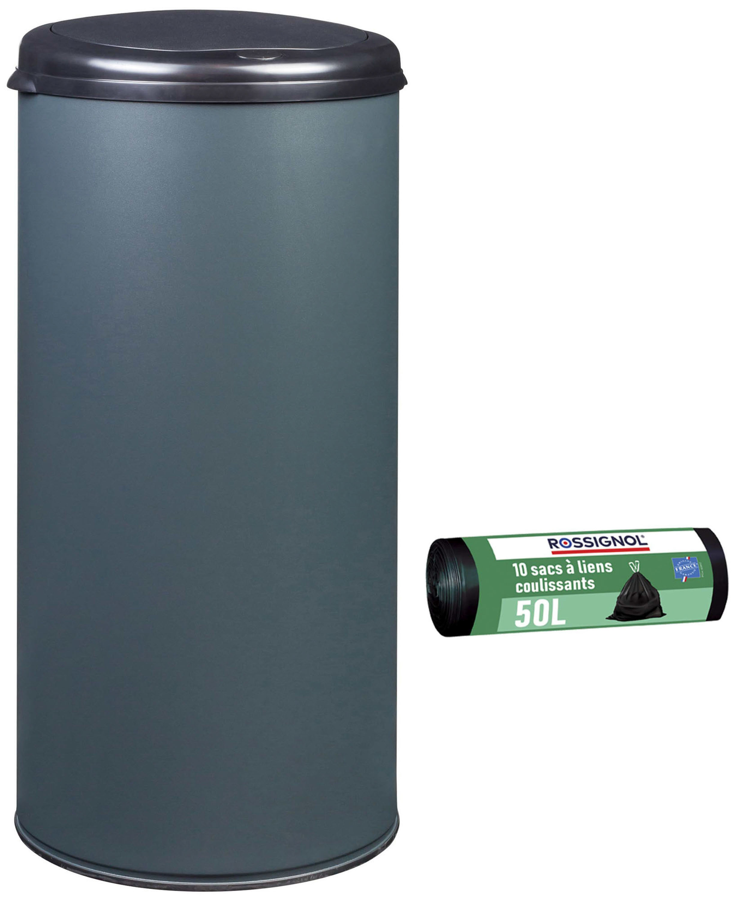 Ensemble avec une poubelle de cuisine 45L à ouverture manuelle et un rouleau de 10 sacs poubelle à liens coulissants 50L La poubelle, HANDTOUCH, facilite la cellecte des déchets en s'ouvrant par simple pression. - Fabrication Française - Contenance : 45 L - Litrage sac conseillé : 50 L - Dimensions : 31 (diamètre) x 67 cm (hauteur) - Matière : 70 % METAL, 30% PLASTIQUE Détails poubelle : - Matériaux recyclables, - Qualité professionnelle : Corps en acier poudré anti-UV ou inox, - Système d'ouverture manuel par simple pression, - Collerette support sac pour maintenir votre sac poubelle, - Embase joint caoutchouc, - Couvercle en ABS, - Possibilité d'ouverture prolongée grâce au bouton open & close Détails sacs : Lot de 10 sacs poubelle à liens coulissants 50L - Labellisés << Origine France Garantie >>, - 100% recyclables, - Sacs résistants et étanches : épaisseur de 28 microns et soudure étoile, - Sacs poubelle fabriqués à partir de 50% de matières végétales renouvelables issues de la canne à sucre, - Cette composition permet de réduire de plus de 60% les émissions de CO2 sur l'ensemble du cycle de vie par rapport au même sac fabriqué à partir de matières pétrolières, - Fermeture pratique avec liens coulissants intégrés, - Rouleau sous bande papier imprimée, - Précaution d'emploi : Ne convient pas à l'emballage de denrées alimentaires. Tenir hors de portée des enfants