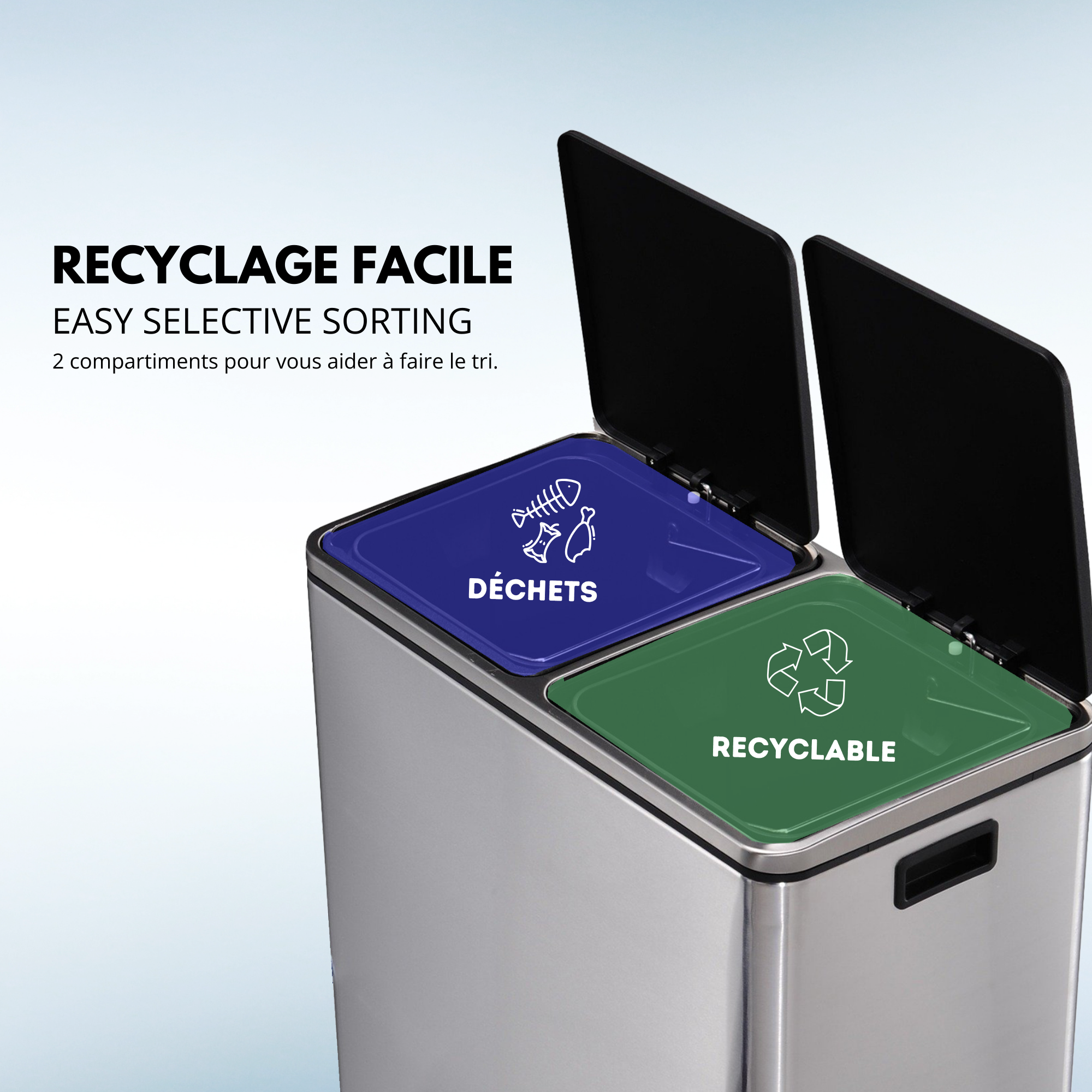 | Plus produit | Deux compartiments 2x30 L, pédales doubles pour ouverture mains libres, couvercle silencieux avec amortisseur, seaux intérieurs amovibles avec anse, base antidérapante, bords de protection plastique, résistant à la corrosion, facile à nettoyer. |