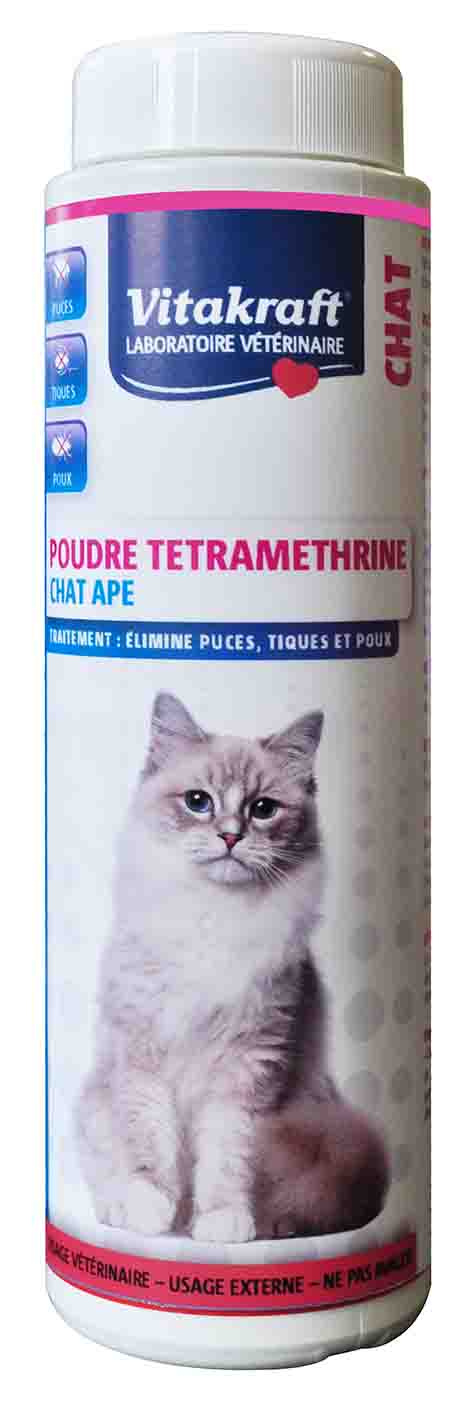 Poudre antiparasitaire qui élimine efficacement les parasites : tiques et puces. A base de Tétraméthrine pour des chats et chatons à partir de 2 mois. Usage externe uniquement. Par voie cutanée : 1 g de poudre par kg de poids corporel ce qui correspond à 4 g de poudre pour un animal de 4 kg Appliquez la poudre sur le pelage, en évitant les yeux et le museau, tout en brossant la fourrure à rebrousse poil pour faire pénétrer le produit. Brossez ensuite le pelage pour faire tomber l’excèdent de poudre.